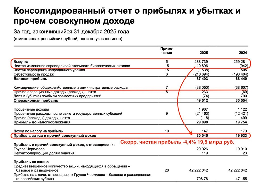 В ноябре прошлого года мы с вами прожарили отчет Черкизово за 3 квартал, зафиксировав стратегическое улучшение финансовых метрик. С момента публикации того отчета акции компании прибавили более 18%, кратно обогнав Индекс Мосбиржи. Настало время разобрать отчет уже за полный 2025 год. Итак, чистая выручка Черкизово за отчетный период выросла на 11,4% до 288,7 млрд рублей. Значимым драйвером роста является сегмент Фудсервиса, который прибавил 19%. Компания продолжает наращивать продажи брендированной продукции в ритейле под марками «Петелинка», «Пава-Пава», «Черкизово» и др. Компания впервые в своей истории произвела за год суммарно более 1,5 млн тонн мяса в живом весе. Это все с учетом объемов свинины (336 тыс. тонн) и объемов индейки (82 тыс. тонн). Также Группа вновь стала крупнейшим производителем мяса бройлеров в России. Себестоимость продаж за 2025 год выросла незначительно, а операционные расходы и вовсе остались на уровне предыдущего года. В итоге Черкизово нарастила скорректированную валовую прибыль и EBITDA на 10,3% до 76,5 млрд рублей и 21,8% до 56,5 млрд соответственно. Важно также отметить сохранение высокой стоимости заемного капитала в 2025 году. Это стало причиной роста чистых процентных расходов с 11,3 млрд рублей в 2024 году до 19,5 млрд в 2025 году. С другой стороны, эти же драйверы привели к сокращению капитальных затрат на 33,1% до 24,3 млрд рублей. Черкизово сосредоточилась на высокодоходных и стратегических проектах, что приведет к органическому росту в будущем. А вот скорректированная чистая прибыль (с учетом чистого изменения справедливой стоимости биологических активов) снизилась на 4,4% год к году до 19,5 млрд рублей. Правда, столь умеренные показатели едва ли ухудшают общую картину. В прошлом разборе я отмечал рост экспортных продаж. По итогам года они выросли на 11% в денежном и на 20% в натуральном выражении. В сухом остатке получаем компанию, которая сохраняет устойчивость в сложный для экономики период и наращивает продажи. Вместе со снижением ключевой ставки ЦБ будут снижаться и расходы на содержание долга, что в будущем приведет и к росту эффективности. Пост взят с международного финтех-медиа ресурса [M O N D I A R A](https://mondiara.com) [Скачать](https://apps.apple.com/ru/app/m-o-n-d-i-a-r-a/id6475953453) приложение в App Store [Скачать](https://play.google.com/store/apps/details?id=com.mondiara.app) приложение в Google Play Источник: ИнвестТема | Литвинов Владимир