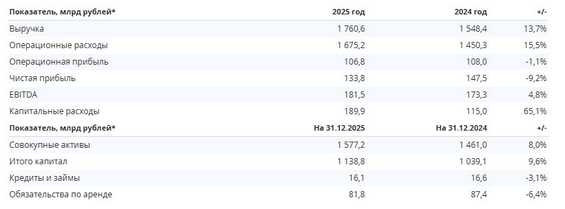 Отчетность за 2025 по МСФО: денежный поток есть, но чистая прибыль снизилась. Цифры неоднозначные: с одной стороны, мощный рост выручки и капитальных затрат, с другой — сокращение «чистоты». Разбираемся в цифрах и считаем, сколько компания может направить на дивиденды. ➥ Главные финансовые итоги 2025 - Выручка: 1 760,6 млрд (+13,7% г/г) — уверенный рост благодаря всем сегментам, кроме зарубежного; - EBITDA: 181,5 млрд (+4,8% г/г); - Чистая прибыль: 133,8 млрд (-9,2% г/г) — ключевой негативный момент для акционеров; - Капитальные затраты (CAPEX): 189,9 млрд (+65,1% г/г) — компания активно инвестирует в модернизацию (КОММод). - Операционные расходы растут быстрее выручки (+15,5% против +13,7%), что и давит на итоговую прибыль. ➥ Баланс и долг (на 31.12.2025) Компания продолжает оставаться «денежным мешком» с минимальной долговой нагрузкой: - Совокупные активы: 1 577,2 млрд (+8,0%); - Капитал: 1 138,8 млрд (+9,6%); - Кредиты и займы: 16,1 млрд (-3,1%). Чистый долг остается отрицательным (денег на счетах существенно больше долгов). ➥ Главный вопрос: дивиденды Производим расчет исходя из payout ratio 25% от чистой прибыли: 1. Чистая прибыль 2025 = 133,8 млрд рублей. 2. Сумма дивидендов к распределению: 133,8 0,25 = 33,45 млрд рублей. 3. Количество акций (обыкновенные, торгуются на бирже) = 1 040,13 млрд (казначейский пакет не учитываем, т. к. он не участвует в расчете на 1 бумагу). 4. Дивиденд на одну акцию: 33,45 млрд / 1 040,13 млрд акций = ~0,0322 рубля на бумагу. ➥ Выводы Компания продолжает генерировать мощный операционный денежный поток (EBITDA растет), но чистая прибыль просела на 9% из-за роста затрат и слабых результатов «Зарубежных активов». СД еще не утверждал рекомендации по дивидендам, но если они последуют логике прошлых лет и озвученным ориентирам, финальная выплата может составить около 3,2 копейки на акцию (9,7% ДД), что при текущих котировках многие сочтут скромной див. доходностью. Не является индивидуальной инвестиционной рекомендацией Пост взят с международного финтех-медиа ресурса [M O N D I A R A](https://mondiara.com) [Скачать](https://apps.apple.com/ru/app/m-o-n-d-i-a-r-a/id6475953453) приложение в App Store [Скачать](https://play.google.com/store/apps/details?id=com.mondiara.app) приложение в Google Play Источник: Залим Сохов - ON FLEEK investing*