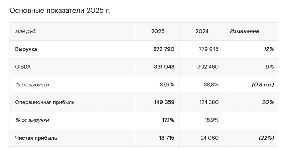 Разберем отчет «Ростелекома» за 12 месяцев 2025 года по МСФО. Видела, что многим он показался не очень хорошим, но, на мой взгляд, он вполне в рамках ожиданий. Что в отчете: ➥ Выручка — 872,8 млрд руб. (+11,9% г/г) ➥ OIBDA — 331,0 млрд руб. (+9,5% г/г) ➥ Чистая прибыль — 18,7 млрд руб. (–22,2% г/г) ➥ Рентабельность по OIBDA — 37,9% (–0,9 п.п.) ➥ Чистая рентабельность — 2,1% (–1,0 п.п.) ➥ Net Debt / OIBDA — 2,1x (снижение с 2,2x) Выручка по итогам года выросла почти на 12%, что существенно выше инфляции. Основные драйверы роста — цифровые сервисы (+20% г/г), оптовые услуги (+14% г/г), мобильный сегмент (+9% г/г). Фиксированная телефония продолжает стагнировать (–6% г/г). Позитив — восстановление темпов роста выручки в цифровых сервисах, в 4-м квартале они подросли на 22% г/г. В [3-м квартале](https://t.me/Investillion/1630) там было резкое замедление, и у меня тут был вопрос, потому что они вносят самый существенный вклад в общий рост по группе. Например, в 4-м квартале их вклад в общий рост по группе был +16% г/г. OIBDA растет медленнее выручки на фоне опережающего роста операционных расходов, маржа незначительно снижается. При этом в IV квартале динамика выглядела лучше: выручка +16%, OIBDA +19%, маржа квартал к кварталу даже немного улучшилась. Конец года получился сильным. Чистая прибыль снизилась на 22% — до 18,7 млрд руб. Причина очевидна: процентные расходы выросли на 42% и достигли 123 млрд руб., но это не сюрприз и катастрофы тут, на мой взгляд, никакой нет. Компания по-прежнему зарабатывает достаточно для обслуживания долга, и у нее даже сохраняется определенный запас прочности. При снижении ключевой ставки именно этот блок станет главным источником роста прибыли — эффект финансового рычага здесь очень заметный. Долговая нагрузка даже немного снизилась и продолжает оставаться управляемой. Ликвидность низкая, но с учетом общей устойчивости это не критично. Компания адаптируется к высоким ставкам и сократила капитальные затраты на 12%. Свободный денежный поток благодаря этому остался на уровне 2024 года (37,8 млрд рублей), что позитивно. Главный вопрос в случае с «Ростелекомом» — дивиденды и ждать ли и в этом году разного размера дивидендов на префы и обычку «Ростелекома». Напомню, что их дивидендная политика предполагает выплату 10% от чистой прибыли по РСБУ на префы и 50% от чистой прибыли по МСФО за обычку, но при этом дивиденды по префам не должны быть меньше дивидендов по обыкновенным акциям. Расчетом в этом году получаем, что из-за снижения чистой прибыли по РСБУ дивиденды по префами обыкновенным акциям должны быть одинаковыми. Скорее всего, они составят 2,68 рублей на акцию, что предполагает около 4,3% дивидендной доходности к текущим. Негусто, но в следующем году на фоне снижения ключевой ставки и постепенного снижения процентных расходов ситуация должна быть гораздо лучше. Если говорить про операционку, то она выглядит достаточно стабильно: абоненты в сегменте В2С в оптике +8% г/г, ARPU +4%, IPTV +6%, виртуальная АТС +14%. Рост идёт в оптике, облаках, кибербезопасности, цифровых услугах. Поэтому тут без сюрпризов. Поэтому, на мой взгляд, какого-то резкого негатива в вышедшем отчете не наблюдается, все в рамках ожиданий. То, что сейчас представляет собой минус в виде снижения чистой прибыли, позднее превратится в точку роста по мере снижения процентных расходов. Плюс тут все еще сохраняются точки роста в виде потенциальных IPO дочерних ГК «Сола