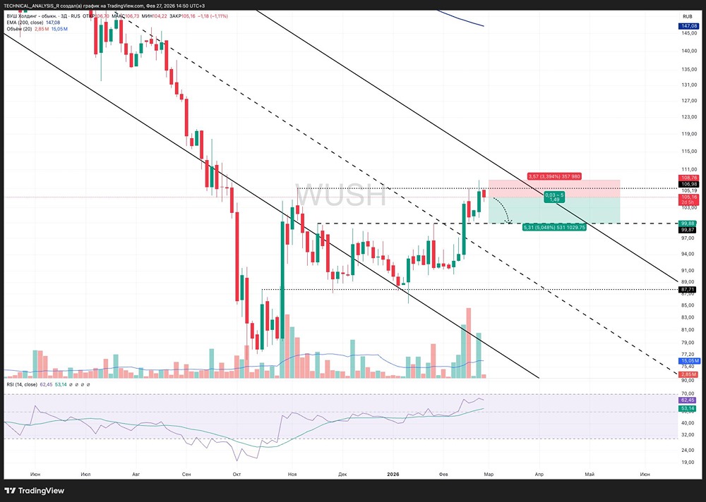 Технический взгляд на акции ВУШ: зона сопротивления 107 рублей и сигнал на снижение котировок