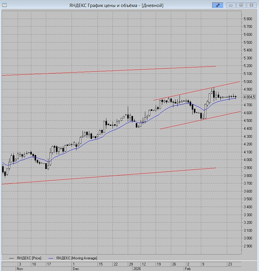 Яндекс продолжает торговаться в боковике, удерживаясь над линией дневной скользящей МА-13. Технически, пока котировки торгуются над данным ориентиром, сохраняется приоритет восходящего тренда с перспективой обновления ближайших дневных максимумов и роста к цене 5000 руб. и выше. Однако лично на мой взгляд, в течение новой торговой недели попытаются сделать коррекцию с пробоем линии индикатора с целью снижения в район цены 4600 руб. (около которой проходит нижняя граница восходящего торгового коридора), и уже оттуда начнут откуп с обновлением упомянутого максимума. При этом спекулятивно по текущим всё же есть сигнал в лонг. Со стоп-лоссом на цене 4750 руб. и целью около цены 5000 руб. Не является индивидуальной инвестиционной рекомендацией Пост взят с международного финтех-медиа ресурса [M O N D I A R A](https://mondiara.com) [Скачать](https://apps.apple.com/ru/app/m-o-n-d-i-a-r-a/id6475953453) приложение в App Store [Скачать](https://play.google.com/store/apps/details?id=com.mondiara.app) приложение в Google Play Источник: Тех.Анализ