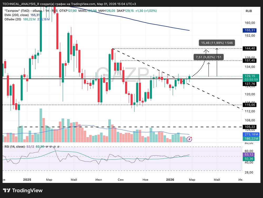 ‼️ Газпром пробивает зону 128 — это локальное сопротивление, которое держало цену несколько недель. Сейчас идёт попытка выхода из боковика. RSI выше 50, импульс есть, но пока без перегрева. Структура начинает формировать повышающиеся минимумы — это плюс. Если закрепятся выше 128-130, вероятность продолжения роста выше среднего. Тогда первая цель 137-138, дальше 144. Потенциал движения примерно 6-12%. Если же пробой окажется ложным и цену вернут ниже 127, тогда снова вернёмся в диапазон 120-128 и импульс затухнет. Ключ сейчас — закрепление. Сам факт прокола уровня ничего не значит. Нужно закрытие выше и удержание. Не является индивидуальной инвестиционной рекомендацией Пост взят с международного финтех-медиа ресурса [M O N D I A R A](https://mondiara.com) [Скачать](https://apps.apple.com/ru/app/m-o-n-d-i-a-r-a/id6475953453) приложение в App Store [Скачать](https://play.google.com/store/apps/details?id=com.mondiara.app) приложение в Google Play Источник: Капибара на Бирже