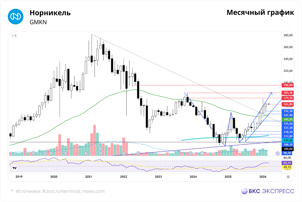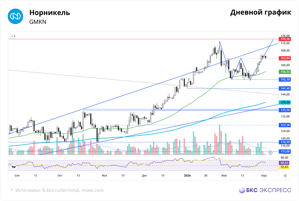 Мнение: БКС Экспресс Прогноз по акциям Норникеля Акции «Норникеля» в пятницу выросли на 2,06%, достигнув 165,2 руб. В выходные бумаги остались на том же уровне, а объем торгов превысил средний — 4,2 млрд руб. Утром в понедельник акции снизились на 0,8% относительно закрытия воскресенья. Краткосрочная картина • Акции индекса МосБиржи в пятницу в основном росли. Сам индекс вырос на 0,49% по итогам основной сессии и на 0,21% вечером. • Рыночные настроения были положительными, несмотря на дипломатическую неопределенность. Обострение ситуации на Ближнем Востоке может перенести переговоры между США, Россией и Украиной. • Еженедельные данные по инфляции подтвердили тренд на её замедление. Зампред ЦБ РФ Алексей Заботкин заявил, что нет необходимости повышать ключевую ставку для замедления роста цен, а разовые всплески цен не важны. • Акции «Норникеля» за неделю выросли на 6,77%. Белая свеча закрылась на 165,2 руб., выйдя из коридора 152–164 руб. на высоких оборотах. Месячную свечу удалось закрыть в плюсе. Длинная нижняя тень указывает на улучшение технической картины. • Драйверами роста стали восходящая динамика ключевых металлов и ожидания ослабления рубля после заявления главы Минфина РФ. • Обострение конфликта на Ближнем Востоке вызвало рост цен на золото до $5360, что может повлиять на другие металлы. Нефть резко выросла до $82 за баррель. Продолжительность конфликта определит устойчивость цен на золото и нефть. Быстрое урегулирование снизит премию за риск и вернет золото к $5000, а нефть — ниже $70. • Для дальнейшего роста акций «Норникеля» нужно, чтобы металлы продолжали дорожать и рубль ослабевал. Без этих факторов акции могут вернуться в коридор 152–164 руб. • Второй отскок от поддержки 152,3 руб. может указывать на паттерн «Двойное дно». Промежуточная цель — 164 руб., основная — 174 руб. Внешний фон • В пятницу S&P 500 упал на 0,43%. Утром фьючерс на S&P 500 снизился на 0,7%. Индексы АТР двигаются разнонаправленно. На мировых рынках платина растет на 0,1%, палладий — на 1,5%, медь теряет 0,4%, никель — 0,3%. Уровни сопротивления: 174,4; 183,4; 196. Уровни поддержки: 152; 147,4; 143. Долгосрочная картина • «Норникель» опубликовал хорошую отчетность за 2025 г. Выручка выросла на 10% до $13,7 млрд, EBITDA — на 9% до $5,7 млрд, скорректированная чистая прибыль сократилась на 7% до $1,9 млрд из-за налогов и процентов по долгу. Свободный денежный поток увеличился на 360% до $1,6 млрд, чистый долг снизился до $9,1 млрд, а соотношение долга к EBITDA — с 1,9х до 1,6х. • В 2026 г. компания ожидает профицит только по никелю, по меди и платине будет дефицит. Рынок палладия будет сбалансирован, но избыточный спрос может создать дефицит. • Январская свеча закрылась по-медвежьи, но февральский бычий пинбар сгладил ситуацию. Достижение 183,4 руб. под вопросом, но возможен рост до январских максимумов около 174 руб. • Долгосрочная техническая картина нейтральная. Котировки поддерживаются высокими ценами на металлы. Золото откатилось от рекордов, но остается дорогим. Ожидаем снижение ключевой ставки ЦБ до 12% к концу 2026 г. Дивиденды возобновятся не раньше 2026 г. при достаточных выплатах от ГРК «Быстринское». • Целевая цена акции «Норникеля» на год — 180 руб., взгляд — «Нейтральный». Автор: Смирнов Андрей Не является индивидуальной инвестиционной рекомендацией [mondiara.com](https://mondiara.com) 👆 Больше новостей и анализа Скачать приложение в [App Store](https://apps.apple.
