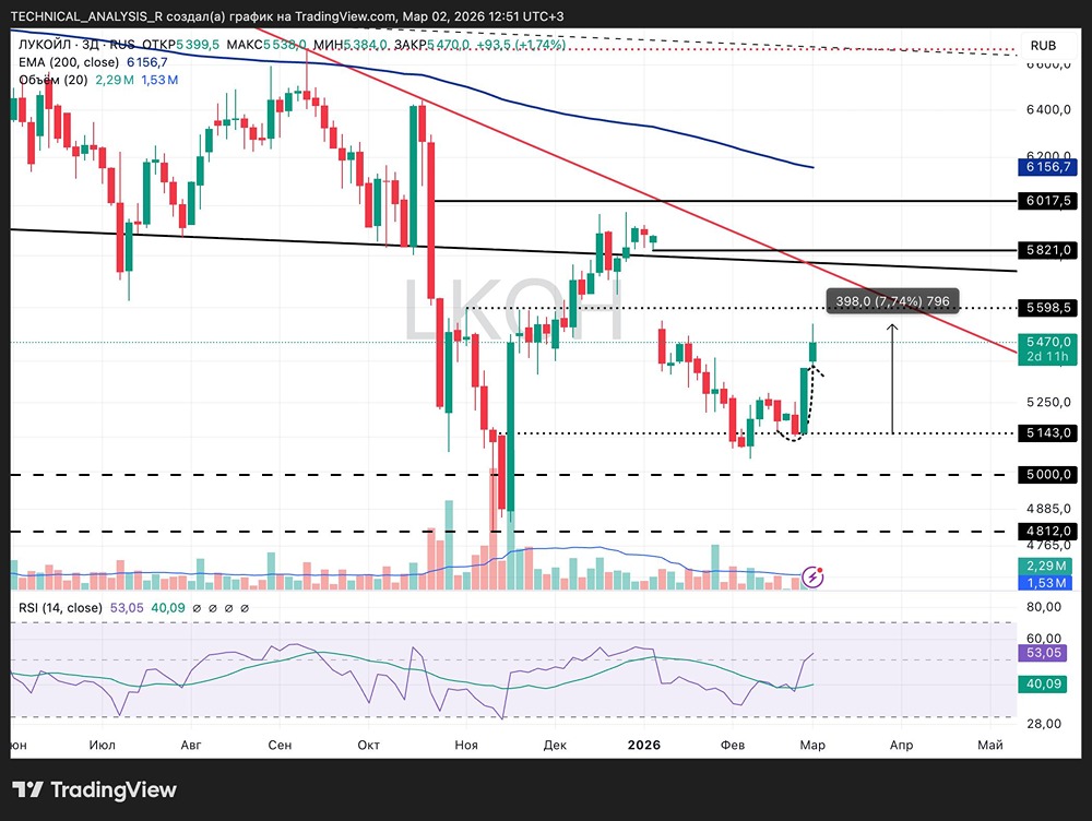 Лукойл чётко отработал поддержку 5140-5200. Отскок по плану и в моменте уже около +7-8%. Реакция сильная, покупатель зашёл агрессивно. Сейчас цена подошла к зоне 5580-5600 — это промежуточное сопротивление. Логично часть позиции уже фиксировать. Когда движение даёт почти 7-8% без отката, жадничать не нужно. Нефтянка в целом растёт на фоне геополитики и роста нефти, поэтому импульс может продолжиться. Если закрепятся выше 5600, следующая цель — 5820. Потенциал ещё около 4-5%. Если же увидим отказ от пробоя 5580-5600, возможен откат обратно к 5300-5200. Часть прибыли фиксируем, остальное можно оставить с подтянутым стопом. Рынок сейчас волатильный, лучше работать поэтапно. Не является индивидуальной инвестиционной рекомендацией Пост взят с международного финтех-медиа ресурса [M O N D I A R A](https://mondiara.com) [Скачать](https://apps.apple.com/ru/app/m-o-n-d-i-a-r-a/id6475953453) приложение в App Store [Скачать](https://play.google.com/store/apps/details?id=com.mondiara.app) приложение в Google Play Источник: Капибара на Бирже