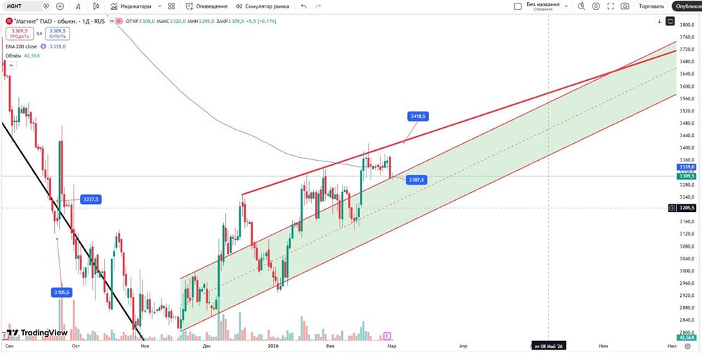 Магнит — крупная российская сеть розничных магазинов, основанная в 1994 году в Краснодаре Сергеем Галицким, который управлял компанией до 2018 года. С 2021 года главным акционером является Marathon Group Александра Винокурова. Финансовые показатели Выручка: - 2021: 1856,1 млрд руб. (+19,46% к 2020 году) - 2022: 2352 млрд руб. (+26,72% к 2021 году) - 2023: 2545 млрд руб. (+4,3% к 2022 году) - 2024: 2776 млрд руб. (+8% к 2023 году) - 2025: 3256 млрд руб. (+13% к 2024 году) Чистая прибыль: - 2021: 51,7 млрд руб. (+56,67% к 2020 году) - 2022: 34,1 млрд руб. (-34,04% к 2021 году) - 2023: 58,7 млрд руб. (+72% к 2022 году) - 2024: 47,8 млрд руб. (-13% к 2023 году) - 2025: 22,4 млрд руб. (-46% к 2024 году) Сравнение мультипликаторов: - P/E: 14; среднее значение: 14,9 - P/BV: 12,2; среднее значение: 9,9 - ROE: 13,9%; среднее значение: 24,6% Акции Акции торгуются с мультипликатором EV/EBITDA на уровне 3,2 и P/E на уровне 14, исходя из наших прогнозов по EBITDA и чистой прибыли на 2025 год. Мы считаем эту оценку справедливой, учитывая высокую неопределенность вокруг рентабельности и дивидендов. Компания завершает пик капитальных затрат. Технический анализ В середине февраля акции закрепились выше верхней границы восходящего канала. На прошлой сессии они протестировали эту линию, что дает возможность для покупок по цене 3307 руб. Цель: 3418 руб. (красный восходящий уровень). Альтернатива: Если акции вернутся выше канала, они могут протестировать уровни внутри него. Первая цель — 3223 руб. (средняя линия канала). Не является индивидуальной инвестиционной рекомендацией Пост взят с международного финтех-медиа ресурса [M O N D I A R A](https://mondiara.com) [Скачать](https://apps.apple.com/ru/app/m-o-n-d-i-a-r-a/id6475953453) приложение в App Store [Скачать](https://play.google.com/store/apps/details?id=com.mondiara.app) приложение в Google Play Источник: БАНКОМАТ