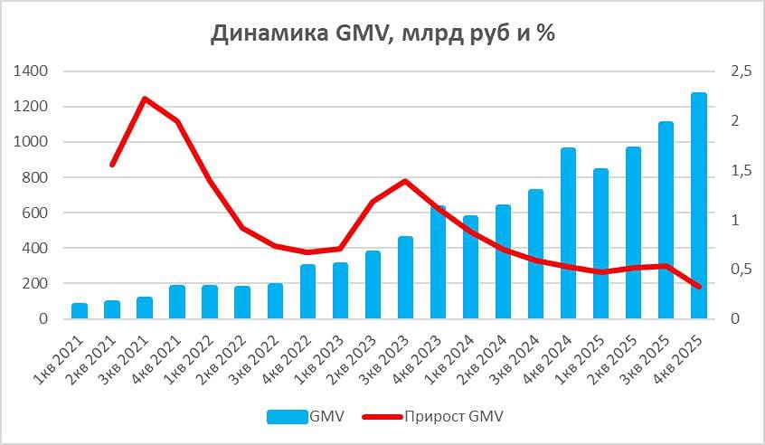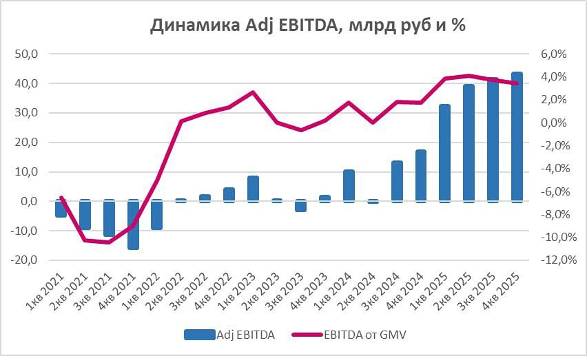 За 2025 год компания претерпела значительные изменения. Она переехала в Россию, выплатила первые дивиденды и вышла на стабильную операционную прибыль. Однако за этими достижениями скрываются и некоторые нюансы. В следующих частях обзора мы разберёмся, переоценён ли Озон. Результаты за 4 квартал: - GMV вырос до 1,3 трлн (+33%). Темп прироста замедлился с пиковых 52%. Компания сократила инвестиции в ассортимент и скидки, сосредоточившись на монетизации текущей базы. - Выручка увеличилась на 43% до 309,3 млрд рублей. - Скорр. EBITDA составила 43,2 млрд, что на 157% больше. Маркетплейс по-прежнему приносит основную часть EBITDA и вышел в прибыль благодаря оптимизации расходов на заказ и повышению тарифов для продавцов. Финтех также не отстаёт: его показатель вырос на 58% до 18,9 млрд рублей. Маржинальность по EBITDA составила 14%, достигнув пика в 17,2% в течение года. Я ожидаю рост до 18% в 2026 году и увеличение доли EBITDA от GMV. Этот показатель демонстрирует стратегию компании: она будет оптимизировать текущий бизнес или расширяться. В 2026 году компания планирует избавиться от неэффективности, чтобы повысить прибыль, несмотря на снижение темпов роста GMV и выручки. Результаты за год: - GMV вырос до 4,2 трлн (+45%). - Выручка достигла 998 млрд (+63%). - Скорр. EBITDA составила 156,4 млрд (+290%). - Маржинальность по EBITDA — 3,8%. - Чистый убыток составил 938 млн (вместо убытка в 59,4 млрд за 2024 год). Компания показывает чистую прибыль уже три квартала подряд благодаря положительной динамике EBITDA. На 2026 год Озон прогнозирует рост GMV на 25–30% и скорректированный показатель EBITDA на уровне 200 млрд рублей. Ожидается чистая прибыль, которая может превысить 50 млрд рублей. Также компания планирует запустить автокредитование и инвестиционную платформу. Вероятно, компания продолжит выплачивать дивиденды, так как они нужны двум основным акционерам: АФК «Система» (для выплаты процентов по кредитам) и Александру Чачаеву (для возврата вложений и погашения долгов перед VK и другими). Доходность может составить около 5%. Отчёт вышел хорошим, но уже учтен в цене. Компания продолжит оптимизировать бизнес, что может привести к снижению темпов роста. Переход на выплату дивидендов может привлечь новых инвесторов и удовлетворить потребности мажоритарных акционеров. В следующей части мы построим прогноз на 2026 год и подробно рассмотрим драйверы роста. Не является индивидуальной инвестиционной рекомендацией Пост взят с международного финтех-медиа ресурса [M O N D I A R A](https://mondiara.com) [Скачать](https://apps.apple.com/ru/app/m-o-n-d-i-a-r-a/id6475953453) приложение в App Store [Скачать](https://play.google.com/store/apps/details?id=com.mondiara.app) приложение в Google Play Источник: Уютный разбирает