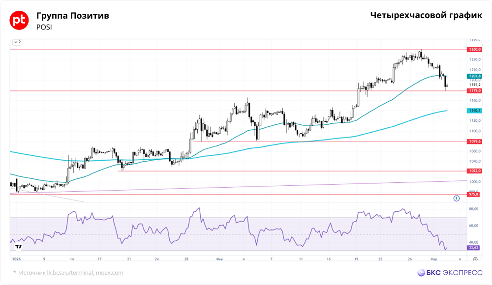 Мнение: БКС Экспресс Прогноз по акциям Группы Позитив Акции Группы Позитив упали на 4,26% В пятницу акции Группы Позитив подешевели на 4,26%, закрывшись на отметке 1191,2 рубля. Объем торгов был высоким — 0,76 млрд рублей. Сегодня с утра бумаги продолжают снижение на 1%. Краткосрочная ситуация • В пятницу акции Группы Позитив значительно снизились на фоне высокой торговой активности. Большинство российских бумаг также показали отрицательную динамику. Индекс МосБиржи вырос на 1,3% за основную сессию и еще на 0,56% за вечернюю. • Утром акции Группы Позитив резко упали, затем попытались восстановиться. Однако в последние часы основной сессии котировки снова снизились, а затем снова начали расти. • День завершился черной свечой с повышенной волатильностью. Акции обновили минимумы прошлой недели и достигли уровня поддержки 1179–1193 рубля. • Причиной падения стало перераспределение ликвидности из акций в более спекулятивные бумаги нефтегазового сектора. Участники рынка начали продавать другие акции, чтобы заработать на росте сырьевых компаний, вызванном геополитической ситуацией. • Такая раскорреляция может продолжаться, пока конфликт остается острым и цены на нефть растут. Сегодня рынок будет реагировать на закрытие Ормузского пролива. • Несмотря на сильное падение в пятницу, акции Группы Позитив могут показать отскок сегодня. Однако в ближайшие дни они, вероятно, останутся под давлением, как и другие акции несырьевого сектора. • С технической точки зрения уровень 1179–1193 рубля является сильным, так как здесь сосредоточены несколько уровней поддержки. Можно рассмотреть возможность частичных покупок. Внешний фон • S&P 500 вырос на 0,04%, утренние фьючерсы на индекс в минусе на 0,8%. Азиатские рынки снижаются. Фьючерсы на Brent на Мосбирже выросли на 9,47%, мировая нефть утром в плюсе на 2%, до $79,2 за баррель. Уровни сопротивления: 1260, 1378,6, 1458,6 Уровни поддержки: 1179, 1080, 1022 Долгосрочная динамика • С марта 2022 года акции Группы Позитив росли, но в конце октября 2024 года тренд был пробит. С исторического максимума бумаги потеряли 63%. • Локальную поддержку акции нашли на уровне 1100 рублей, откуда начался отскок, но устойчивый рост не состоялся. • В сентябре 2025 года акции снова обновили годовые минимумы и нашли опору в районе 930 рублей. Бумаги отступили от этих уровней, но остаются в консолидации. • Восходящая динамика продолжается, но акции приблизились к первому сопротивлению в районе 1250 рублей. Возможен локальный откат от этого уровня при сохранении общей восходящей тенденции. Взгляд аналитиков БКС: «Негативный», целевая цена на год — 1100 рублей. Автор: Решетников Олег Не является индивидуальной инвестиционной рекомендацией [mondiara.com](https://mondiara.com) 👆 Больше новостей и анализа Скачать приложение в [App Store](https://apps.apple.com/ru/app/m-o-n-d-i-a-r-a/id6475953453) Скачать приложение в [Google Play](https://play.google.com/store/apps/details?id=com.mondiara.app) Пост взят с международного сервиса для инвесторов и трейдеров [M O N D I A R A](https://i.mondiara.com/) Источник: bcs-express.ru