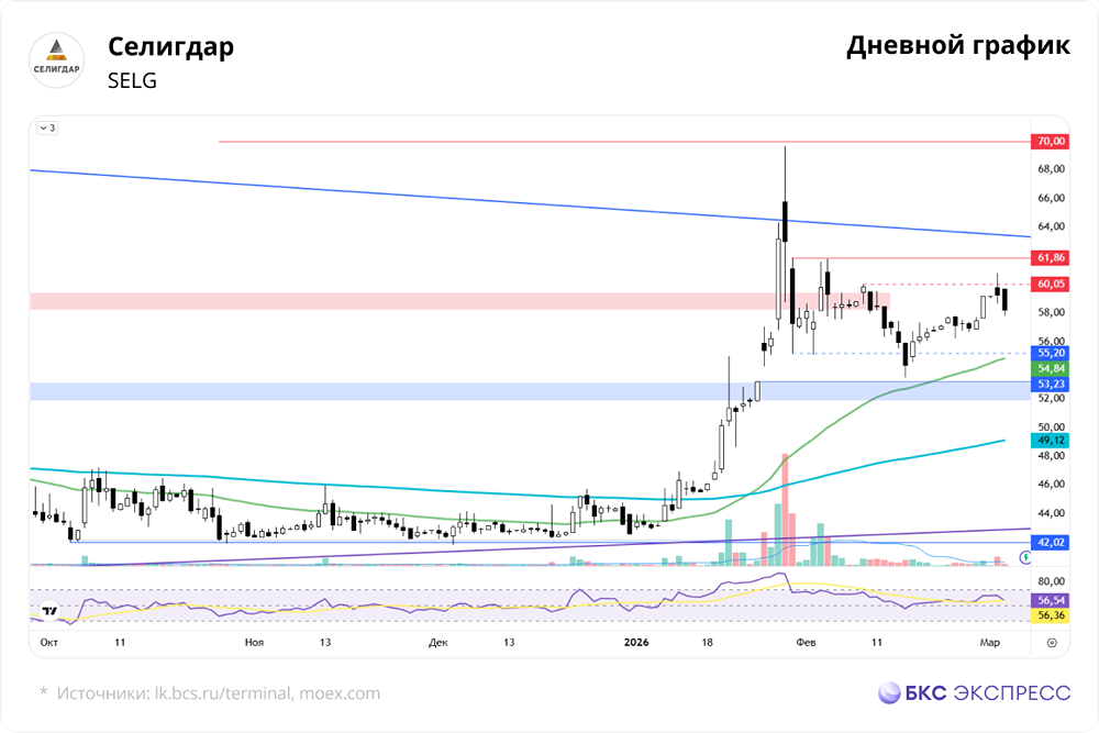 Мнение: БКС Экспресс Прогноз по акциям Селигдар Акции «Селигдара» в понедельник выросли на 0,19%, достигнув 59,29 руб. Объем торгов был выше среднего и составил 788 млн руб. Утром вторника бумаги снизились на 2% по сравнению с закрытием понедельника. Краткосрочная картина • Акции Индекса МосБиржи в пятницу преимущественно росли. Сам индекс вырос на 1,3% к концу основной сессии и еще на 0,59% на вечерних торгах. • Основным драйвером рынка стали акции нефтегазовых компаний и золотодобывающих компаний. Конфликт на Ближнем Востоке привел к росту цен на золото, так как оно считается защитным активом. Появились опасения по поводу возможной блокады Ормузского пролива. • До открытия американских рынков сохранялась надежда на продолжение роста. Однако после этого биткойн и фьючерсы на S&P 500 резко выросли, что показало, что участники рынка не считают конфликт с участием США поводом для продажи рискованных активов и покупки защитных инструментов. Золото достигло $5435 за унцию, но к концу дня его цена снизилась до $5350. • В середине февраля акции «Селигдара» пробили уровень поддержки 55 руб., однако снижение остановилось на уровне интереса покупателей 52–53,2 руб. После этого котировки начали расти и достигли 61,9 руб. Сейчас основными препятствиями для дальнейшего роста являются нисходящий тренд и круглая отметка 60 руб. • Прошлую неделю акции завершили умеренно позитивно после формирования бычьего пинбара. Эта свеча указывает на возможные попытки тестирования нисходящего тренда и ближайших уровней сопротивления. • Акции «ЮГК» в 2026 году демонстрируют динамику, схожую с акциями «Селигдара», несмотря на регуляторные риски. В то же время акции «Полюса» отстают по волатильности и накопленной доходности. Это может свидетельствовать о переносе интереса инвесторов на бумаги с более низкой базой. • Золото может продолжить рост, если конфликт в Иране затянется. Даже незначительные трудности США в достижении своих целей могут привлечь внимание инвесторов к защитным активам. • В случае продолжения роста золота акции «Селигдара» могут попытаться пробить уровень сопротивления 61,9 руб. Без поддержки золота основным сценарием станет возврат к 60 руб. и дальнейшее боковое движение в диапазоне 53–60 руб. Внешний фон В понедельник индекс S&P 500 вырос на 0,04%, а сегодня фьючерсы на этот индекс снизились на 0,7%. Индексы Азиатско-Тихоокеанского региона (АТР) торгуются в основном в красной зоне. На мировых рынках фьючерсы на золото прибавляют около 0,3% и стоят $5330 за унцию. Уровни сопротивления: 61,9, 65, 70 Уровни поддержки: 55,2, 49,5, 42 Долгосрочная картина С сентября 2024 года акции «Селигдара» демонстрировали преимущественно нисходящую динамику. Котировки удерживались выше 40 руб. благодаря коротким периодам роста, амплитуда которых постепенно уменьшалась. Выход из сужающегося треугольника, который формировался с конца 2024 года, произошел вверх. Это позволило пробить ряд технических уровней сопротивления и приблизиться к 70 руб. Таким образом, локальное дно можно считать сформированным. На акции оказывает давление неоднозначность финансовых результатов и внутрикорпоративная неопределенность. Это не всегда позволяет следовать за динамикой золота. Рост котировок часто принимает характер хаотичных всплесков спроса, которые усиливаются при благоприятных условиях. В то же вре
