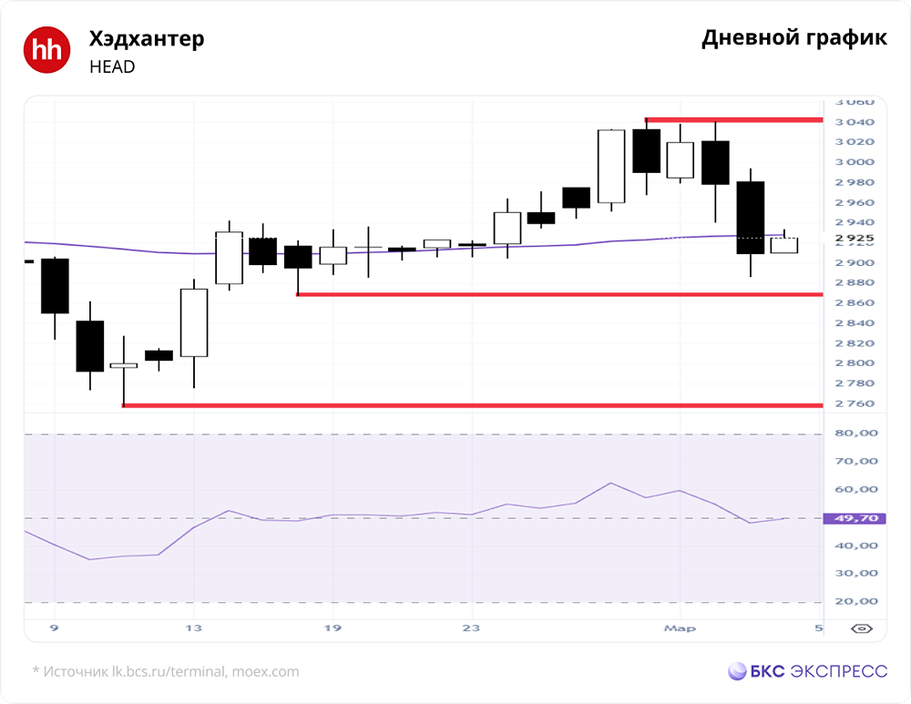 Мнение: БКС Экспресс Прогноз по акциям Хэдхантер Акции HeadHunter на прошлой торговой сессии потеряли 2,32%, закрывшись на уровне 2909 рублей. Бумаги показали себя хуже рынка, объем торгов составил 0,74 млрд рублей. Краткосрочная перспектива • Во вторник акции пробились ниже недельной поддержки на уровне 2904, опустившись до минимума в 2886. Началась коррекция после первой волны роста в долгосрочной картине. • Ждем завершения коррекции и реакции покупателей. Первый сигнал для возобновления роста — пробой уровня 2994, который теперь сместился на следующий дневной максимум. • На дневном графике индекс RSI находится на уровне 49 пунктов. На 4-часовом графике акции торгуются между 50-дневной и 200-дневной скользящими средними. Основное внимание уделяем уровням сопротивления и поддержки: 3041 и 2756. Внешний фон • Индекс S&P 500 во вторник снизился на 0,92%. Утром он был в минусе на 0,4%. Основные азиатские индексы также в красной зоне. Однако нефть марки Brent выросла на 4,71%, начав день с роста на 2,5%. Уровни сопротивления: 3041, 3114, 3270 Уровни поддержки: 2886, 2867, 2756 Долгосрочная перспектива • На недельном графике акции показали первый импульс роста. Ожидается завершение коррекции в области 2820–2900 и последующая реакция покупателей. • Потенциал роста первых целей — 3114–3131. Пока поддержка на уровне 2756 не пробита, сценарий роста остается актуальным. • Краткосрочные и среднесрочные движения оцениваем по краткосрочной картине. На долгосрочной перспективе важно следить за закрытием недельной свечи в пятницу. • HeadHunter планирует опубликовать результаты за IV квартал 2025 года в пятницу, 6 марта. • По итогам 2025 года ожидается рост выручки около 4%, что немного превышает ранее озвученные прогнозы (+3% г/г). Уровень издержек остается важным фактором. • Даже при замедлении роста выручки (или ее отсутствии в IV квартале) компания остается высокорентабельной и прибыльной. Ждем решения по дивидендам за II полугодие 2025 года. • Наш взгляд на HeadHunter — «Позитивный». Целевая цена на горизонте года — 4800 рублей за акцию. Учитывая наши ожидания по будущим денежным потокам, считаем, что акции недооценены. Однако общеэкономическая ситуация остается сложной. Например, число вакансий в феврале снизилось на 27% г/г после падения на 30% в январе 2026 года. Наш текущий прогноз роста выручки на 2026 год — 10% г/г, но более вероятным кажется рост около 5% г/г. Автор: Мамонтов Андрей Не является индивидуальной инвестиционной рекомендацией [mondiara.com](https://mondiara.com) 👆 Больше новостей и анализа Скачать приложение в [App Store](https://apps.apple.com/ru/app/m-o-n-d-i-a-r-a/id6475953453) Скачать приложение в [Google Play](https://play.google.com/store/apps/details?id=com.mondiara.app) Пост взят с международного сервиса для инвесторов и трейдеров [M O N D I A R A](https://i.mondiara.com/) Источник: bcs-express.ru