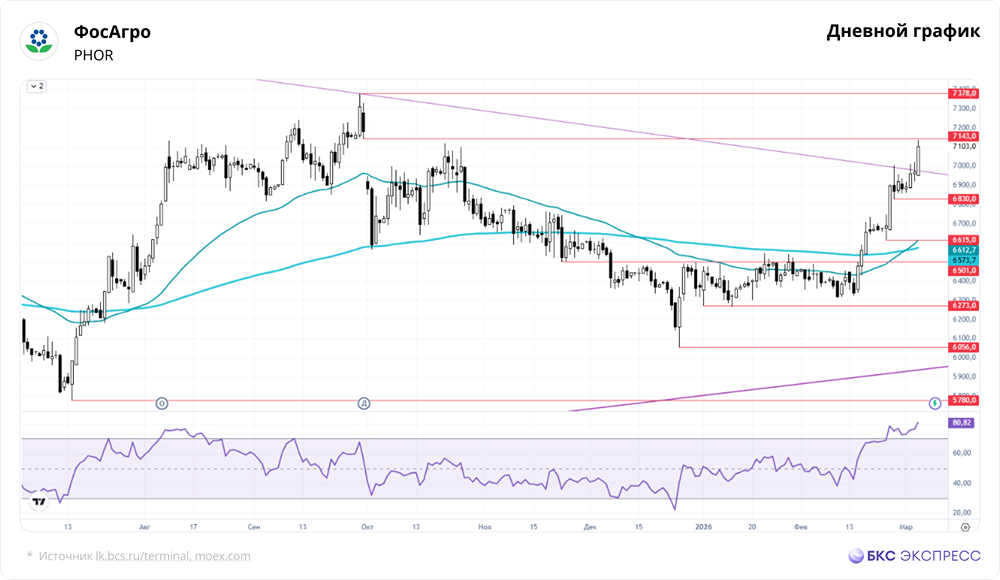 📣 Мнение: БКС Экспресс: рост и перспективы. В среду акции ФосАгро выросли на 1,91% до 7103 руб., при этом объем торгов был значительным — 1,19 млрд руб. На утро четверга бумаги все еще в плюсе на 0,5%. Краткосрочная динамика • В среду акции ФосАгро показали заметный рост на фоне высокой торговой активности. Российские бумаги вчера демонстрировали разнонаправленную динамику: индекс МосБиржи снизился на 0,54% за основную сессию и еще на 0,14% к вечеру, по сравнению с закрытием вторника. • Днем акции ФосАгро активно росли, но после достижения уровня сопротивления начался откат. Вечером наблюдалась новая волна укрепления бумаг. • День завершился «белой свечой» со средней амплитудой, обновив максимумы с конца октября 2025 года. Это позитивный сигнал. • Во второй половине февраля динамика акций ФосАгро ускорилась. Бумаги вышли из двухмесячного боковика и закрыли дивидендный гэп сентября 2025 года. Причина — конфликт на Ближнем Востоке, откуда поставляется большая часть мировых азотных удобрений. • Покупки сейчас выглядят дорого. Индекс RSI на дневном таймфрейме находится в зоне сильной перекупленности (выше 80). • Однако рост может продолжаться до прояснения ситуации с завершением конфликта на Ближнем Востоке. В этом случае можно рассмотреть локальные продажи при замедлении восходящей динамики, что технически возможно при достижении уровня 7143–7378 руб. Внешний фон В среду индекс S&P 500 вырос на 0,78%. Утром фьючерс на индекс снизился на 0,4%. В Азии индексы снижаются. На Мосбирже фьючерс на нефть Brent вырос на 1,33%, на международных площадках нефть в плюсе на 2%, до $83,4. Уровни сопротивления: 7143 / 7378 / 7893 Уровни поддержки: 6830 / 6615 / 6501 Долгосрочная динамика Глобальный тренд акций ФосАгро — восходящий тренд с августа 2014 года, проходящий около 3200 руб. Долгосрочный нисходящий тренд от марта 2022 года был пробит в декабре. Устойчивого роста не наблюдалось, поэтому тренд был скорректирован по последним локальным максимумам. Вчера бумага пробила скорректированный тренд, но учитывая сильную перекупленность, быки могут попасть в ловушку. На недельном графике произошло оживление: прорыв двухмесячного боковика и подход к максимумам 2025 года, где может последовать откат. ❗️ Аналитики БКС дают негативный прогноз. Целевая цена на 12 месяцев — 4700 руб. Автор: Решетников Олег Не является индивидуальной инвестиционной рекомендацией Пост взят с международного финтех-медиа ресурса [M O N D I A R A](https://mondiara.com) ➠ [веб-приложение](https://mondiara.com) ➠ [Скачать](https://apps.apple.com/ru/app/m-o-n-d-i-a-r-a/id6475953453) на iPhone ➠ [Скачать](https://play.google.com/store/apps/details?id=com.mondiara.app) на Android Источник: bcs-express.ru
