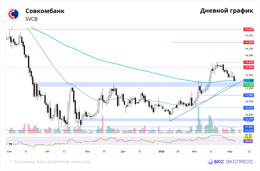 Мнение: БКС Экспресс Прогноз по акциям Совкомбанка Акции Совкомбанка выросли на 0,76% до 13,33 руб. в среду. Объем торгов достиг 1,7 млрд руб. Утром в четверг акции прибавили 0,15% к закрытию среды. Краткосрочная картина • Акции Индекса МосБиржи снизились на 0,54% к концу основной сессии и еще на 0,14% на вечерних торгах. • Снижение ключевой ставки до 15,5% и мягкий сигнал ЦБ после февральского заседания помогли акциям Совкомбанка подняться выше 13,5 руб. и 200-дневной скользящей средней, достигнув 14 руб. Однако дальнейший рост не продолжился. • В конце февраля акции начали снижаться, отдаляясь от 5-месячных максимумов. Сейчас они тестируют 200-дневную скользящую, вблизи которой проходит восходящий тренд с января 2026 года. Вчерашнее закрытие ниже этой границы может указывать на продолжение нисходящего движения. Для улучшения ситуации необходимо закрытие недели выше EMA 200. • Фокус на нефтегазовый сектор ослабевает. Конфликт в Иране, вероятно, скоро завершится, и цены на нефть Brent стабилизировались ниже $85. После трех дней роста инвесторы фиксируют прибыль, переключая внимание на другие сектора. • Инвесторы остаются под давлением. Внимание к Ближнему Востоку отвлекает от попыток урегулирования украинского конфликта. ЦБ РФ заявил, что снижение цены отсечения нефти без корректировки бюджета может замедлить снижение ключевой ставки. Еженедельные данные по инфляции немного смягчили этот негатив. • Монетарные опасения продолжают давить на акции Совкомбанка. Снижение цены отсечения нефти может привести к пробою ближайших поддержек и коррекции до 12 руб. Чувствительность к статистике и заявлениям ЦБ будет нарастать по мере приближения к заседанию 20 марта. • Важно следить за устойчивостью 200-дневной скользящей средней. Неопределенность вблизи поддержек может привести к снижению до 13 руб. Закрытие недели выше EMA 200 откроет путь к 14,25 руб. Внешний фон • В среду S&P 500 вырос на 0,78%. Сегодня фьючерс на индекс в минусе на 0,4%. Индексы АТР растут. Нефть Brent утром подорожала на 3,2% до $84 за баррель. Уровни сопротивления: 14,25 / 14,5 / 15. Уровни поддержки: 13,5 / 13 / 12,5. Долгосрочная картина • Первичное размещение акций Совкомбанка состоялось в декабре 2023 года по цене 11,5 руб. за акцию. За полгода они выросли на 75%, достигнув 20,5 руб., но затем вернулись к цене IPO из-за коррекции. • В рамках второго среднесрочного роста акции приблизились к 19 руб., после чего вновь вернулись к уровню IPO. Каждый цикл роста и снижения занимал около года. • В феврале 2026 года акции преодолели 200-дневную скользящую среднюю. Сейчас они тестируют этот уровень, и его пробой может запустить новую волну снижения. • Февральское закрытие свечи было позитивным, но длинная верхняя тень вызывает сомнения в устойчивости роста. Существует риск формирования локального максимума около 14,25 руб. • Финансовые результаты Совкомбанка за III квартал 2025 года оказались сильными. Они показывают стабилизацию стоимости риска, рост чистой процентной маржи и чистых комиссионных доходов. В условиях смягчения денежно-кредитной политики и низкой базы акции имеют потенциал для роста. • Целевая цена аналитиков БКС на год составляет 19 руб. Оценка бумаг — «Позитивная». Автор: Смирнов Андрей Не является индивидуальной инвестиционной рекомендацией Пост взят с международного финтех-медиа ресурса [M O N D I A R A](https://mondiara.com) ➠ [веб-приложение](h