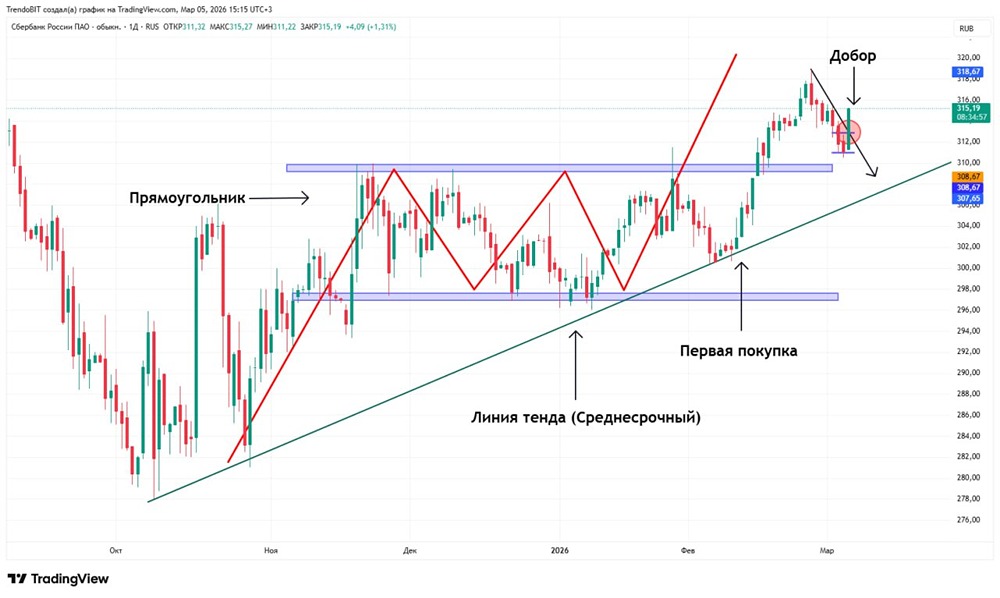 ‼️ Сбербанк, увеличение позиции! Напоминаю, фиксировали часть в момент коррекционного движения с целью докупить ниже. Причины увеличения позиции (Коррекция закончена / Заканчивается). ➥ Пробой локальной наклонной. В момент коррекционного движения формируется нисходящий тренд. Сейчас он завершен, пробили наклонную, сейчас закрепляемся. ➥ Ретест (Подтверждение). Вернулись на к предыдущей модели роста «Прямоугольник». Диапазон сопротивления стал диапазоном поддержки. ➥ Пришли к ЕМА 50. После пересечения ЕМА 200 и ЕМА 50 сформировался золотой крест (Модель на рост). ➥ Закругление Осцилляторов. StochRSI в перепроданности, попытки закругления. От RSI идет к верхней границе. Получили сигнал на покупку. Среднесрочная цель остается прежняя: 326р. – 329р. Не является индивидуальной инвестиционной рекомендацией Пост взят с международного финтех-медиа ресурса [M O N D I A R A](https://mondiara.com) ➠ [веб-приложение](https://mondiara.com) ➠ [Скачать](https://apps.apple.com/ru/app/m-o-n-d-i-a-r-a/id6475953453) на iPhone ➠ [Скачать](https://play.google.com/store/apps/details?id=com.mondiara.app) на Android Источник: Trendoman "Торговые сигналы"