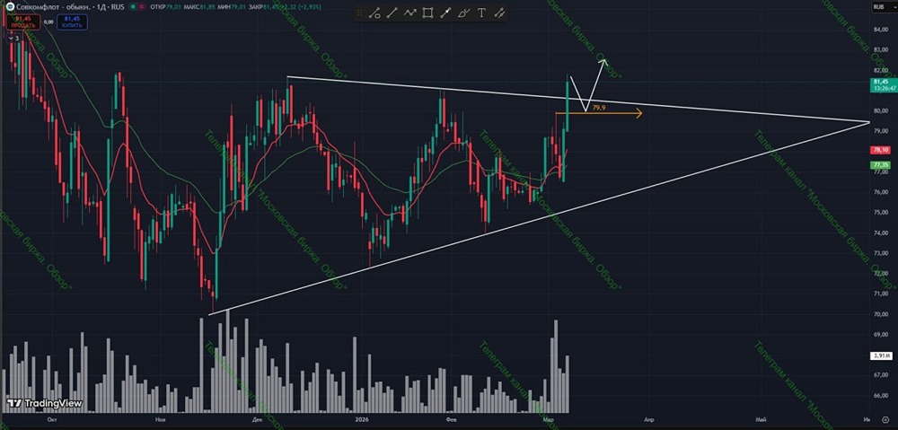 Сегодня растем сильно, собственно, как и вчера, однако объемы показываем в разы больше. Это значит, что на максимумах нас встретил продавец. Идет борьба в зоне сопротивления. По фигуре если рассматривать, что наклонную пробили и нужно сделать коррекцию, чтобы начать работать с акцией. Нормальной на сегодняшний день для меня считается коррекция до ближайшего пробитого максимума, а это примерно 79,9 рублей. Можем показать боковую коррекцию, тогда я тоже буду рассматривать к покупке, если сделаем хорошую техническую фигуру — треугольник и тому подобное. Покупать на максимумах не буду, уже встретились с продавцом. Работаем по стратегии с соблюдением правил риска. Не является индивидуальной инвестиционной рекомендацией Пост взят с международного финтех-медиа ресурса [M O N D I A R A](https://mondiara.com) ➠ [веб-приложение](https://mondiara.com) ➠ [Скачать](https://apps.apple.com/ru/app/m-o-n-d-i-a-r-a/id6475953453) на iPhone ➠ [Скачать](https://play.google.com/store/apps/details?id=com.mondiara.app) на Android Источник: Московская Биржа. Обзор