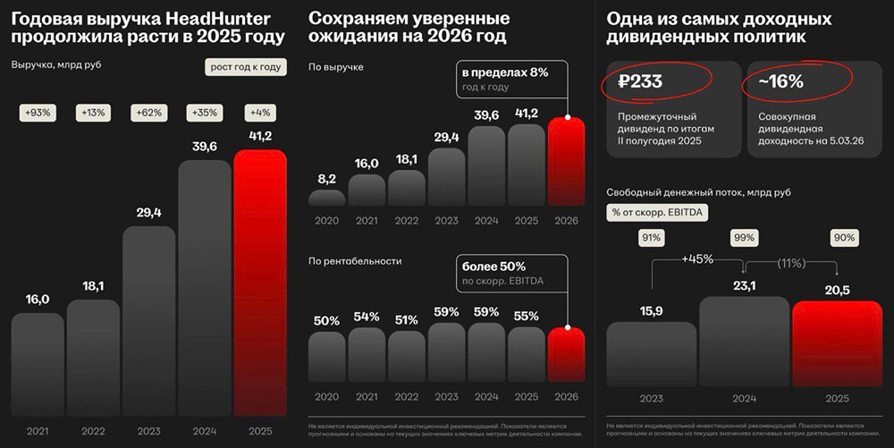 Краткий отчет о результатах HeadHunter за 2025 год Количество вакансий, по данным HeadHunter, продолжает снижаться, что связано с общей экономической ситуацией. Несмотря на это, HeadHunter сумел немного увеличить выручку в 2025 году и показал чистую рентабельность более 50%. Основные результаты за 2025 год: - Выручка: 41,2 млрд руб. (+4% г/г) - Скорректированная EBITDA: 22,8 млрд руб. (-2% г/г) - Скорректированная чистая прибыль: 20,8 млрд руб. (-15% г/г) Компания выполнила прогнозы по росту выручки и рентабельности по скорректированной EBITDA, но прибыль снизилась по двум причинам: более быстрый рост расходов по сравнению с выручкой и снижение процентных доходов из-за более низкой средней ставки ЦБ. Выручка направления HRTech выросла до 2,5 млрд руб. (+94% г/г), что составляет около 6% от общей выручки. Этот сегмент впервые показал прибыль по EBITDA в четвертом квартале 2025 года. Чистая денежная позиция компании достигла 11,4 млрд руб. (с учетом обязательств по аренде). Совет директоров рекомендовал выплату дивидендов в размере 233 руб. на акцию. За 2025 год будет распределено около 116% скорректированной чистой прибыли. У компании достаточно средств для выплат, и дивидендная доходность за год составит около 16%. Восстановление экономики пока не началось, и первый квартал 2026 года будет непростым. Однако компания продолжает генерировать денежные средства и выплачивать щедрые дивиденды. Прогноз на 2026 год: Дмитрий Сергиенков, CEO HeadHunter, ожидает улучшения рыночной конъюнктуры в этом году, что во многом связано с смягчением денежно-кредитной политики. В 2026 году компания прогнозирует рост выручки до 8% и рентабельность EBITDA выше 50%. В целом у бизнеса все хорошо, и акции компании оценены справедливо. При изменении ситуации на рынке труда здесь может образоваться хороший потенциал роста. Не является индивидуальной инвестиционной рекомендацией Пост взят с международного финтех-медиа ресурса [M O N D I A R A](https://mondiara.com) ➠ [веб-приложение](https://mondiara.com) ➠ [Скачать](https://apps.apple.com/ru/app/m-o-n-d-i-a-r-a/id6475953453) на iPhone ➠ [Скачать](https://play.google.com/store/apps/details?id=com.mondiara.app) на Android Источник: TAUREN ИНВЕСТИЦИИ