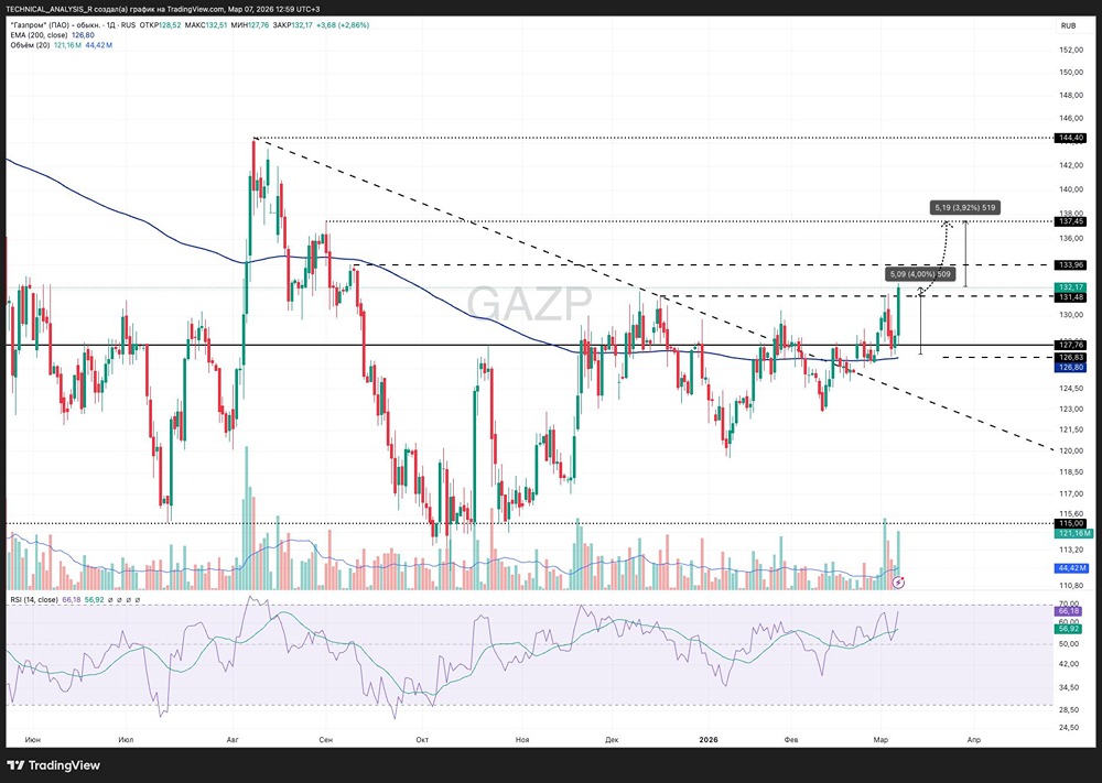 🔥 Сейчас цена отскочила уже на 4% после публикации моей идеи Газпром ранее также пробил локальную нисходящую линию тренда и закрепился выше ЕМА200. Это важный сигнал, который говорит о возможном продолжении восходящего движения после длительной консолидации. Сейчас цена подошла к зоне сопротивления 131.5. Если покупатели смогут удержаться выше этой области, следующей целью станет уровень 133.9. Выше располагается более сильное сопротивление в районе 137.4, где ранее проходили крупные продажи. Пока структура выглядит как выход из длительного боковика. Важный уровень поддержки сейчас находится в районе 127.7. Если цена удержится выше него, движение вверх может продолжиться. Если же цена вернётся ниже, возможен возврат обратно в диапазон. Не является индивидуальной инвестиционной рекомендацией Пост взят с международного финтех-медиа ресурса [M O N D I A R A](https://mondiara.com) ➠ [веб-приложение](https://mondiara.com) ➠ [Скачать](https://apps.apple.com/ru/app/m-o-n-d-i-a-r-a/id6475953453) на iPhone ➠ [Скачать](https://play.google.com/store/apps/details?id=com.mondiara.app) на Android