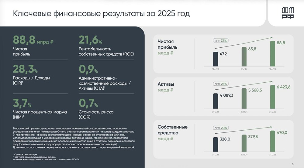 Можно долго спорить, институт ли это развития или просто очень большой ипотечный банк с особой миссией. Но раз уж компания стала публичной, давайте смотреть цифры. Пробежимся сегодня по отчетности ДОМ.РФ за полный 2025 год и разберемся, стоит ли игра свеч. Итак, чистые процентные доходы за отчетный период выросли на 31,7% до 161,9 млрд рублей. При этом процентные расходы давили на маржу, подскочив до 689,1 млрд рублей. Но куда важнее динамика резервов: создание «провизий» под кредитные убытки выросло в 1,7 раза до 31,2 млрд рублей. Это первый звоночек, сигнализирующий о росте рисков в секторе. Кредитный портфель за год раздулся более чем на триллион и достиг 5,32 трлн рублей. Основной вклад — финансирование жилищного строительства и арендного жилья. Сам банк заявляет о нейтральности к движению ставки, но его окружение (девелоперы) буквально задыхается от дорогих денег. ‼️ Основной риск заключается в проектном финансировании: на фоне сжатия льготных программ и роста затрат строителей качество этого портфеля в 2026 году может преподнести сюрпризы. Капитал компании подрос как органически, так и за счет IPO. Дисконт, который наблюдался при размещении, стремительно сократился после ралли в акциях. При этом менеджмент ведет себя крайне активно: компания заботливо считает за нас будущий TSR по итогам 2026 года, а руководство со сцены призывает покупать бумаги. Лично меня такая избыточная вербальная поддержка всегда настораживает. Чистая прибыль компании выросла на 35% до 88,8 млрд рублей. Прибыль до налогообложения и вовсе показала рывок на 44,1%, достигнув 107,8 млрд рублей. Рентабельность капитала (ROE) на уровне 21,2% говорит о том, что год для компании выдался по-настоящему ударным — выложились максимально. В итоге мы имеем качественный, но специфический актив. Текущая дивидендная доходность за 2025 год уже не выглядит лучше конкурентов, а риски завязаны на одну-единственную отрасль, переживающую не лучшие времена. Вопрос «чем это лучше Сбера?» сейчас актуален как никогда. Я пока предпочту понаблюдать за тем, как застройщики будут переваривать высокую ставку в 2026 году. Не является индивидуальной инвестиционной рекомендацией Пост взят с международного финтех-медиа ресурса [M O N D I A R A](https://mondiara.com) ➠ [веб-приложение](https://mondiara.com) ➠ [Скачать](https://apps.apple.com/ru/app/m-o-n-d-i-a-r-a/id6475953453) на iPhone ➠ [Скачать](https://play.google.com/store/apps/details?id=com.mondiara.app) на Android Источник: ИнвестТема | Литвинов Владимир
