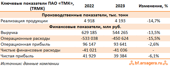 Мнение: УК Арсагера. Итоги 2023 года: высокая долговая нагрузка побуждает компанию к допэмиссиям. ТМК раскрыла консолидированную финансовую отчетность и выборочные операционные показатели за 2023 г. Ключевые показатели Трубная Металлургическая Компания, (TRMK) 2023. Общая выручка ТМК снизилась на 13,5%, составив 544,3 млрд руб. на фоне выделения части активов «Волжского трубного завода» и ЧТПЗ по выпуску труб большого диаметра и их реорганизации в рамках присоединения к ООО «ТМК Трубопроводные решения», а также продажи Европейского дивизиона в 2022 г. Объем реализации трубной продукции составил 4 193 тыс. тонн. (-14,7%), из которых 3 431 тыс. тонн пришлось на бесшовные трубы, а 762 тыс. тонн – на сварные. Операционные расходы сократились на 15,5%, составив 450,6 млрд руб., на фоне снижения себестоимости реализации трубной продукции на 17,0%, составившей 387,1 млрд руб. В результате операционная прибыль компании сократилась на 2,6% до 93,6 млрд руб. В блоке финансовых статей отметим сокращение расходов на обслуживание долга (с 33,9 млрд руб. до 31,1 млрд руб.) на фоне снижения процентных ставок, несмотря на увеличение долговой нагрузки компании с 283,2 млрд руб. до 319,6 млрд руб. В то же время отрицательные курсовые разницы увеличились с 3,2 млрд руб. до 7,6 млрд руб. Таким образом, чистые финансовые расходы остались на прошлогоднем уровне. В итоге чистая прибыль компании составила 39,4 млрд руб., снизившись на 6,1% по сравнению с прошлым годом. В апреле текущего года совет директоров компании должен рассмотреть вопрос о выплате дивидендов по итогам 2023 г. Напомним, что в отчетном году компания уже выплачивала промежуточный дивиденд в размере 13,45 руб. на акцию (около 50% заработанной прибыли). Помимо этого, она провела SPO в рамках которого основной акционер - ООО «ТМК Стил Холдинг» - разместил 18,0 млн акций (1,74% от общего количества) по цене 220,68 руб. В ходе вторичного размещения акций компания привлекла 3,97 млрд руб. В начале текущего года ТМК провела дополнительную эмиссию акций по закрытой подписке в пользу основного акционера по цене вторичного размещения. Достаточно хорошие показатели компании во многом объясняются снижением цены на сталь и сохранением заказов на трубы со стороны ключевых потребителей. По итогам вышедшей отчетности мы подняли прогноз по доходам и операционной прибыли на всем прогнозном периоде. При этом прогноз по чистой прибыли был незначительно снижен из-за роста финансовых расходов и эффективной ставки по налогу на прибыль. Помимо этого мы увеличили прогноз по дивидендным выплатам. В результате потенциальная доходность акций несколько возросла. Изменение ключевых прогнозных показателей Трубная Металлургическая Компания, (TRMK) 2023 На данный момент акции ТМК торгуются с P/BV 2024 около 2,1 и не входят в число наших приоритетов. Автор: Елена Ланцевич. [Не является индивидуальной инвестиционной рекомендацией]