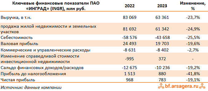 Мнение: УК Арсагера. Итоги 2023 года: средние результаты в ударном строительном году. Группа ИНГРАД опубликовала консолидированную отчетность по МСФО по итогам 2023 г. К сожалению, застройщик не раскрыл ключевые операционные показатели, а также данные по оценке рыночной стоимости портфеля проектов, что существенно затруднило обновление модели компании. Согласно данным отчетности, общая выручка компании составила 63,4 млрд руб. (-23,7%), из которых 61,3 млрд руб. пришлись на доходы от продажи жилой недвижимости. Валовая маржа компании по отчетного периода выросла с 29,5% до 31,1%. На обслуживание банковской задолженности компания потратила 10,9 млрд руб. (11,6 млрд руб. годом ранее). Общая долговая нагрузка составила 149,3 млрд руб., при этом чистый долг сократился с 169,5 млрд руб. до 122,7 млрд руб. За вычетом остатков на эскроу-счетах чистый долг вырос с 102,5 млрд руб. до 108,0 млрд руб. Финансовые доходы сократились с 2,1 млрд руб. до 1,6 млрд руб. Еще 372 млн руб. компания отразила в отчетности в виде восстановления стоимости инвестиционной недвижимости. В результате чистые финансовые расходы сократились на 19,2% до 10,2 млрд руб. В результате чистая прибыль компании составила 783 млн руб. (-19,1%). Среди прочих моментов отметим, что балансовая стоимость акции по состоянию на конец полугодия составила 215 руб. Стоимость недостроя, отраженная в балансе компании по стандартам МСФО (инвестиционная недвижимость плюс запасы), составила 134,1 млрд руб. По итогам вышедшей отчетности, оказавшейся хуже наших ожиданий, мы понизили прогнозную линейку стоимости портфеля проектов компании, приняв во внимание фактические показатели собственного капитала, стоимости недостроя и операционную рентабельность. Также мы обнулили наши ожидания по дивидендам на ближайший год. В результате потенциальная доходность акций компании сократилась. В настоящий момент акции ИНГРАДа торгуются с P/BV скор. 2024 около 2,3 и не входят в число наших приоритетов. Автор: Елена Ланцевич. [Не является индивидуальной инвестиционной рекомендацией]