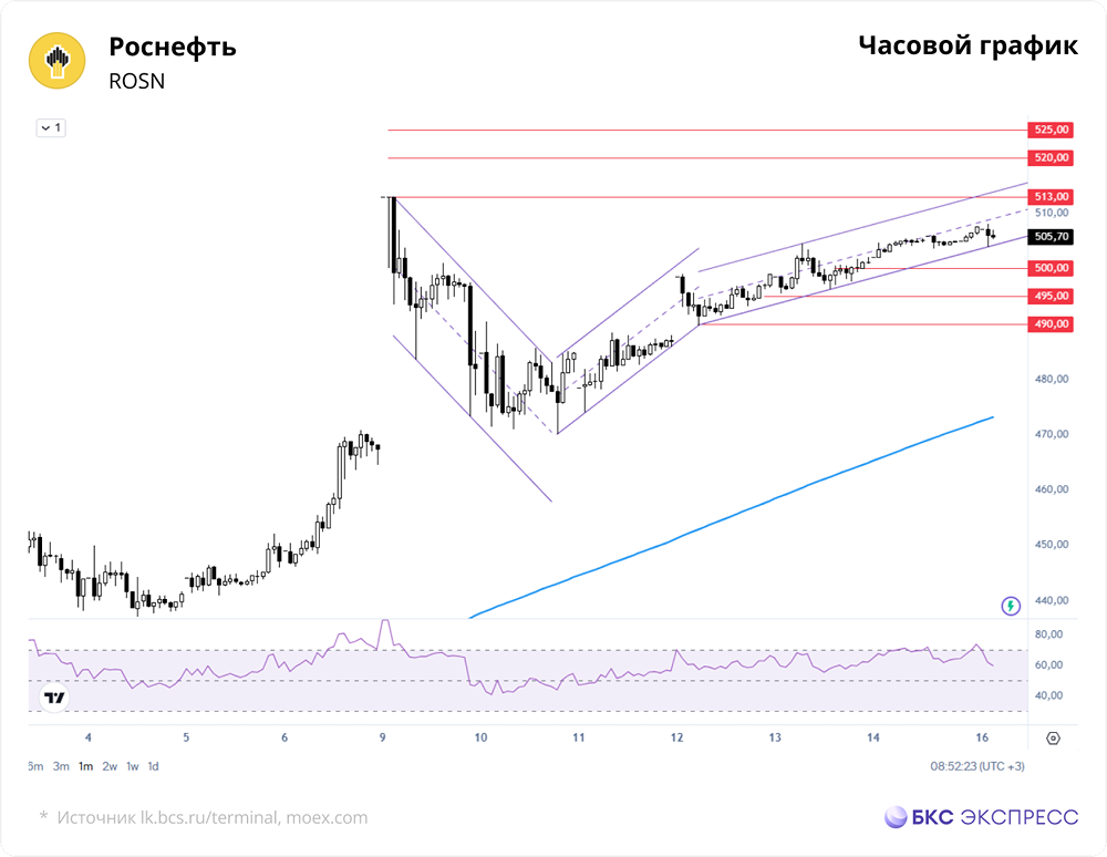 📣 Мнение БКС Экспресс. Акции «Роснефти» подорожали на 1,3% — до 507,6 руб. — по сравнению с закрытием в пятницу. Объем торгов достиг 3,7 млрд руб. Утром бумаги потеряли часть роста — до 506,65 руб., что составило 1,11%. Краткосрочная перспектива В выходные акции выросли умеренно, а торги были вялыми. На фоне высоких цен на нефть бумаги «Роснефти» выглядели сильнее рынка. С начала марта техническая картина на дневном графике улучшилась. Закрытие прошло выше 200-часовой скользящей средней, что указывает на умеренно позитивный краткосрочный тренд. Утреннее значение индикатора RSI на часовом графике говорит о близости к состоянию перекупленности. Утром акции перешли в фазу консолидации. Однако в ближайшие дни возможен возврат к недельному максимуму — 513 руб. Это связано с улучшением фундаментальных условий. Внешний фон Индекс S&P 500 потерял 0,61% в пятницу. Утром фьючерс на S&P 500 вырос на 0,5%. Азиатские индексы в основном падают. Нефть Brent подорожала на 1,2% — до $104,4 за баррель. ❗️ Уровни сопротивления: 513 / 520 / 525 ❗️ Уровни поддержки: 500 / 495 / 490 Долгосрочная перспектива В конце октября акции «Роснефти» достигли минимума с мая 2023 года. После этого среднесрочный нисходящий тренд завершился. В начале марта бумаги превысили 200-дневную скользящую среднюю, что делает долгосрочную техническую картину нейтральной. 🔥 Аналитики прогнозируют цену в 520 руб. к концу года, что предполагает рост на 3% от текущего уровня. Автор: Манжос Виталий Не является индивидуальной инвестиционной рекомендацией [mondiara.com](https://mondiara.com) 👆 Больше новостей и анализа Скачать приложение в [App Store](https://apps.apple.com/ru/app/m-o-n-d-i-a-r-a/id6475953453) Скачать приложение в [Google Play](https://play.google.com/store/apps/details?id=com.mondiara.app) Пост взят с международного сервиса для инвесторов и трейдеров [M O N D I A R A](https://i.mondiara.com/) Источник: bcs-express.ru