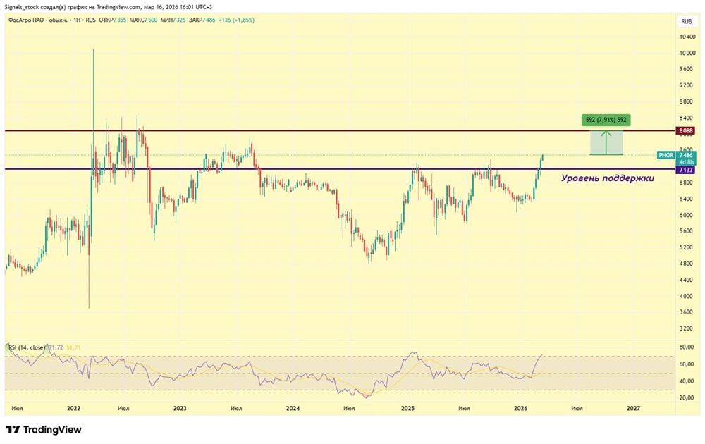 🔥 С момента последней наводки котировки выросли на 17% — не самый очевидный бенефициар геополитической напряжённости на Ближнем Востоке вполне оправдал мои ожидания. Пару слов о технике — наконец состоялся пробой сильного сопротивления 7100, ниже которого акции торговались с сентября 2023 года. И сейчас всё смотрится достаточно сильно, но смущает перекупленность, которая уже даже на недельном таймфрейме. А потому перед продолжением роста есть вероятность увидеть откат в район поддержки. Остался ли потенциал роста? Обратите внимание на американских коллег ФосАгро — в частности UAN и CF, которые на этом фоне взлетели на 40%. Последний так вообще эпично обновил исторические максимумы. А потому мой прогноз о штурме сопротивления 7600-7700 вполне актуален, возможно, даже до 8000 хватит сил. Да и СМИ пестрят очень громкими статьями на сей счёт — если вкратце, то есть риск глобального продовольственного кризиса. ❗️ Вот одно из мнений: Всё большее число заводов по производству удобрений вынуждено закрываться, поскольку война в Иране приводит к росту цен на природный газ до уровней, делающих производство аммиака и мочевины экономически нежизнеспособным на многих рынках. Природный газ является основным сырьём для азотных удобрений, и энергетический шок, вызванный перебоями в поставках через Ормузский пролив, теперь непосредственно влияет на сельскохозяйственные цепочки поставок, причем рису, пшенице и другим основным культурам грозит нехватка ресурсов перед началом ключевых посевных сезонов. Связь между удобрениями и продовольствием является одним из наименее обсуждаемых, но наиболее значимых вторичных эффектов резкого роста цен на нефть и газ. Страны в Южной и Юго-Восточной Азии, Африке к югу от Сахары и Латинской Америке, которые импортируют как энергоносители, так и удобрения, сталкиваются с усугубляющимся шоком: более высокие затраты на топливо для сельского хозяйства одновременно с сокращением доступности удобрений. Энергетический кризис 2022 года дал представление о такой динамике, когда резкий рост цен на природный газ привел к падению производства аммиака в Европе примерно на 70% в течение нескольких месяцев. ❌ Если конфликт не будет разрешен до весеннего посевного сезона в Северном полушарии, последствия для цен на продовольствие будут продолжаться далеко за пределы 2026 года. Важно — с текущих я бы не рассматривал к покупке, а надеялся на ретест 7100-7150 и уже оттуда присматривался в случае отскока. Пост больше для тех, кто прислушался к февральской наводке и купил перед самым началом роста. В общем, локально котировки могут остыть, но если заварушка на Ближнем Востоке продлится ещё хотя бы пару недель, то на фоне роста цен на газ и удобрения потенциал не исчерпан (вот это рыжий, конечно, натворил делов). Не является индивидуальной инвестиционной рекомендацией Пост взят с международного финтех-медиа ресурса [M O N D I A R A](https://mondiara.com) ➠ [веб-приложение](https://mondiara.com) ➠ [Скачать](https://apps.apple.com/ru/app/m-o-n-d-i-a-r-a/id6475953453) на iPhone ➠ [Скачать](https://play.google.com/store/apps/details?id=com.mondiara.app) на Android Источник: Сигналы для торговли