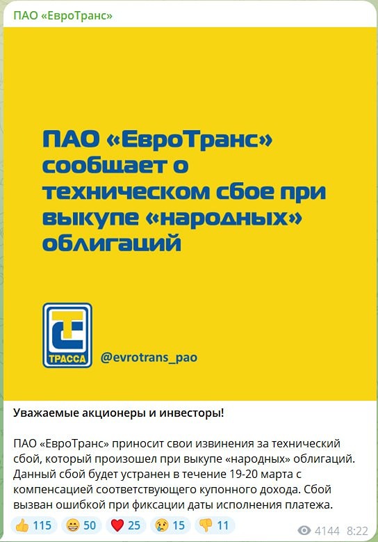 ‼️ ТЕХНИЧЕСКИЙ ДЕФОЛТ СБОЙ ЕВРОТРАНС Есть такие «народные» облигации, которые по условиям эмиссии можно предъявить к выкупу по номиналу в любой момент времени, а эмитент обязан их выкупить в течение определенного срока после этого. Такие есть и у Евротранса. Так вот, вчера на платформе, где размещены эти бонды, разгорелась паника, что эмитент вовремя не занес деньги на погашение предъявленного объема. Сегодня эмитент отчитался о возникшем техническом сбое, хотя обращайся такие облигации на Мосбирже, это бы называлось техническим дефолтом. Занятно, что в этот раз в облигациях эмитента обошлось без сильной паники, однако очень важно, как на такой технический сбой отреагирует рейтинговое агентство. Например, 05.03.2026 «Эксперт РА» поставил рейтинг эмитента под наблюдение на фоне рисков из-за возникших исков и блокировки счетов от ФНС. Также рынок испугался, что в методологии «Эксперт РА» возникновение технического дефолта означает снижение рейтинга до C. Однако завтра из него уже должны выйти, со слов эмитента. Станет ли рейтинговое агентство считать это тех. дефолтом — еще один вопрос, на который пока нет ответа. Все-таки среди «народных» облигаций Евротранс создал прецедент. В общем, я думаю, что рейтинговое агентство запросто может и закрыть глаза на такую ситуацию в моменте и не прибегать к активным действиям. Однако очередной звоночек прозвенел. Негатива вокруг эмитента и так хватает, если поверх этого еще и рейтинг решат понизить, будет совсем печально. Не является индивидуальной инвестиционной рекомендацией Источник: Igor_Shimko