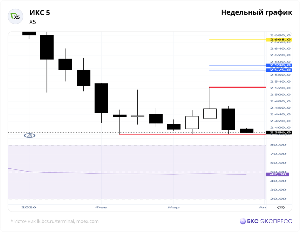 📣 Мнение БКС Экспресс. В прошлую пятницу акции ИКС 5 снизились на 0,6%, закрывшись на уровне 2382,5 рубля. Бумаги показали себя лучше рынка, а объем торгов составил 1,57 миллиарда рублей. Краткосрочная картина В понедельник акции снова пытаются удержаться на уровне поддержки 2380,5 рубля. Текущий минимум дня — 2383,5 рубля, и покупатели пока защищают этот уровень. Ситуация остается напряженной: если акции удержатся выше 2380,5 рубля, это будет сигналом к продолжению роста. Если же они пробьют этот уровень, это может стать началом более сильного снижения. Первый важный сигнал для разворота вверх — это пробой сопротивления на уровне 2400 рублей. На дневном графике индикатор RSI находится на отметке 40 пунктов, а на 4-часовом — ниже 200- и 50-дневной скользящих средних. Внешний фон Индекс S&P 500 на прошлой неделе упал на 1,73%, но в начале текущей недели он немного вырос. Индексы Азиатско-Тихоокеанского региона (АТР) торгуются в основном в отрицательной зоне. Нефть марки Brent, напротив, выросла на 4,22% и утром торгуется с плюсом на 2,3%. ❗️ Уровни сопротивления: 2400, 2435, 2524,5 рубля. ❗️ Уровни поддержки: 2383,5, 2380,5, 2346 рублей. Долгосрочная картина На недельном графике наблюдается попытка отмены сценария роста. Согласно этому сценарию, цели могли бы быть следующими: 2575–2590 и 2668 рублей. Однако пока поддержка на уровне 2380,5 рубля не сломана, контроль остается за покупателями, и сценарий роста остается актуальным. Важно обратить внимание на закрытие недельной свечи в конце торгов пятницы. Это может дать дополнительные сигналы о дальнейшем направлении движения акций. ИКС 5 — крупнейший российский ритейлер по выручке, владеющий торговыми сетями «Пятерочка», «Перекресток» и «Чижик». По итогам 2026 года ожидается дивидендная доходность в 12%: 175 рублей за 9 месяцев и 177 рублей по итогам всего года. Однако высокий уровень капитальных затрат может ограничить объем будущих выплат. По состоянию на 2025 год капитальные затраты составляли около 5,5% выручки. Территориальная экспансия, включая развитие транспортной инфраструктуры, может продолжиться и в 2026 году. По данным компании, ИКС 5 лидировал в сегменте электронной торговли продуктами и товарами повседневного спроса (e-grocery) по итогам 2025 года. GMV этого сегмента в бизнесе ритейлера составил 323,7 миллиарда рублей, а доля ИКС 5 на рынке онлайн-продаж выросла до 18,6%, по данным агентства INFOline. На конец года экспресс-доставка была доступна из 9544 магазинов, включая 7315 магазинов «Пятерочка», 909 супермаркетов «Перекресток» и 1320 дискаунтеров «Чижик», в 75 регионах России. 🔥 Взгляд БКС: «Позитивный».Целевая цена по акциям ИКС 5 на горизонте 12 месяцев — 3700 рублей. Автор: Мамонтов Андрей Не является индивидуальной инвестиционной рекомендацией Источник: bcs-express.ru