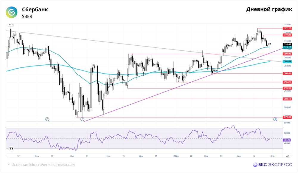 📣 Мнение БКС Экспресс. Акции Сбербанка в понедельник выросли на 0,19% до 314,48 руб. Объем торгов составил 8,5 млрд руб., что является средним показателем. Сегодня утром акции торгуются без изменений. Краткосрочная перспектива В понедельник акции Сбербанка показали небольшой рост при среднем уровне торговой активности. В целом, динамика российских акций была разнонаправленной. Индекс МосБиржи вырос на 0,4% по итогам основной сессии и закрылся с приростом в 0,35% по сравнению с закрытием пятницы. Акции Сбербанка весь день колебались, но практически не изменились в цене. День завершился свечой с небольшим черным телом и удлиненными тенями сверху и снизу, что указывает на нейтральную динамику. С одной стороны, это может говорить о стабилизации нисходящего тренда, с другой — отсутствуют явные признаки разворота. Индикатор RSI находится около уровня 50, что указывает на возможность дальнейшего снижения. Однако динамика на широком рынке остается сложной. Индекс МосБиржи вернулся к уровню 2800 пунктов, отскочив от 200-дневной скользящей средней, но не смог преодолеть круглую отметку. Это повышает вероятность тестирования уровня и нового витка снижения. Давление на рынок оказывает пауза в переговорах между Россией и Украиной, которая, вероятно, продлится до достижения значимых договоренностей по ближневосточному конфликту. В текущих условиях рекомендуется придерживаться ранее озвученной стратегии: фиксировать прибыль частями в диапазоне 322–330 руб. Возвращаться к покупкам стоит при снижении цены до 308–312 руб. Внешний фон S&P 500 в понедельник снизился на 0,39%. Фьючерсы на индекс утром в плюсе на 0,7%. Азиатские индексы двигаются разнонаправленно. Фьючерсы на Brent на МосБирже выросли на 0,03% по сравнению с закрытием понедельника, в то время как на мировых площадках нефть снизилась на 1,3% и торгуется на уровне $107,1. ❗️ Уровни сопротивления: 319, 322,1, 327 ❗️ Уровни поддержки: 310, 300,4, 296,2 Долгосрочная перспектива Акции Сбербанка торгуются на 19% ниже исторического максимума. Геополитическая ситуация в феврале 2022 года привела к пробитию многолетнего тренда, начавшегося в 2014 году. Поддержка найдена на уровне пологого растущего тренда, берущего начало от минимумов 2009 года. Акции уверенно росли до середины 2024 года, после чего началась коррекция. Снижение удалось остановить в декабре 2024 года благодаря решению ЦБ не повышать ключевую ставку, что привело к смене среднесрочного тренда на восходящий. Ближайшая цель — закрепление выше максимумов 2024 года, которые находятся на уровне 330 руб. За прошлую неделю акции Сбербанка потеряли 1,65%. Неделя завершилась черной свечой и обновлением минимумов. Повышаются шансы на продолжение снижения. Первая поддержка на недельных свечах находится в районе 310 руб. 🔥 Аналитики БКС считают акции Сбербанка «позитивными». Целевая цена на год — 420 руб. Автор: Решетников Олег Не является индивидуальной инвестиционной рекомендацией Источник: bcs-express.ru