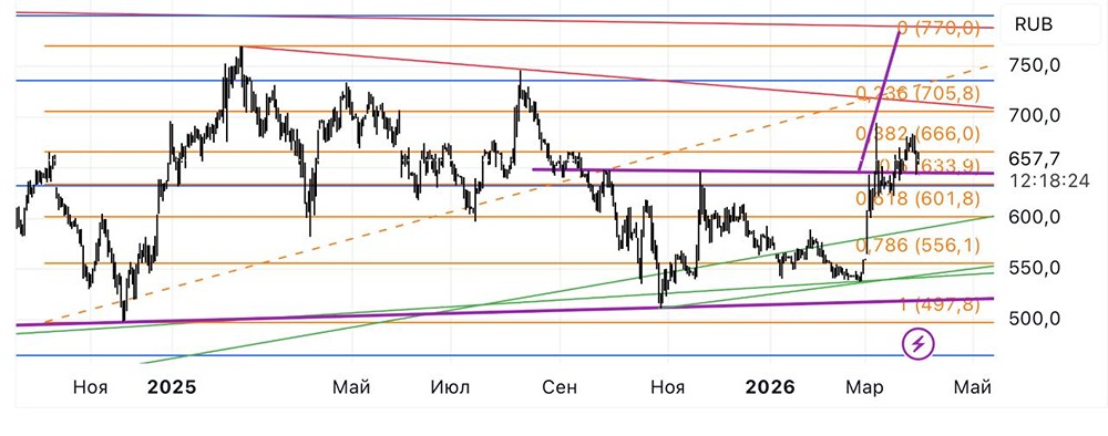 🚩 Татнефть: вымпел или двойное дно? Ждать ли импульс уже на неделе? Отвечаем на вопрос подписчика: «Мне одному кажется, что в Татнефти вымпел? И будет ли ещё один рывок?» Разберём через технику и фундамент. Если смотреть дневной график, то классического вымпела там нет. Скорее просматривается двойное дно с ретестом — более надежная разворотная формация. Потенциальная цель — ~770 руб., где проходит сильное сопротивление (нисходящий тренд ещё с 2018 года). Если переключиться на недельный таймфрейм, картина уже ближе к вымпелу/флагу: сначала был импульс, затем пошла фаза сжатия диапазона. 📌 Важный момент: обе модели дают схожие цели, но пока цена не закрепилась выше ~700 руб., говорить о сильном лонге рано. Фундамент: что происходит Отчётность вышла слабой: чистая прибыль просела примерно на 42%, выручка — около 10%. Давление оказали крепкий рубль и слабая нефть. Но при этом картина не выглядит критично. У компании по-прежнему отрицательный чистый долг, сильный баланс и солидный запас ликвидности. Плюс сохраняется щедрая дивидендная политика — около 50% прибыли и выше. Ключевой драйвер сейчас — нефть. При эскалации на Ближнем Востоке цены могут уходить к $120+, а при снижении напряжения — возвращаться в диапазон $90–100. По сути, акции Татнефти сейчас — это ставка на динамику нефти. Что в итоге Техника даёт шанс на движение вверх, но без пробоя 700 это всё ещё локальная история внутри диапазона. Фундамент не разгоняет рост, но и не ломает идею полностью. 🗣 Наше мнение: Текущая ситуация по Татнефти — это баланс между слабым 2025 годом и потенциально сильным 2026-м за счёт нефти. С технической точки зрения формируется база (двойное дно + консолидация), но ключевой триггер остаётся за внешним фоном. Если нефть удержится на высоких уровнях, бумаги вполне могут дойти до зоны 750–800 руб. Но заходить «на пробой» прямо сейчас рискованно: уровень ~700 остаётся критическим сопротивлением. Оптимально — либо ждать уверенного закрепления выше, либо работать от откатов внутри диапазона. В краткосроке импульс возможен, но скорее спекулятивный. Среднесрочная идея сохраняется, но завязана на нефть и макро. Не является индивидуальной инвестиционной рекомендацией Источник: Коношевская Ольга