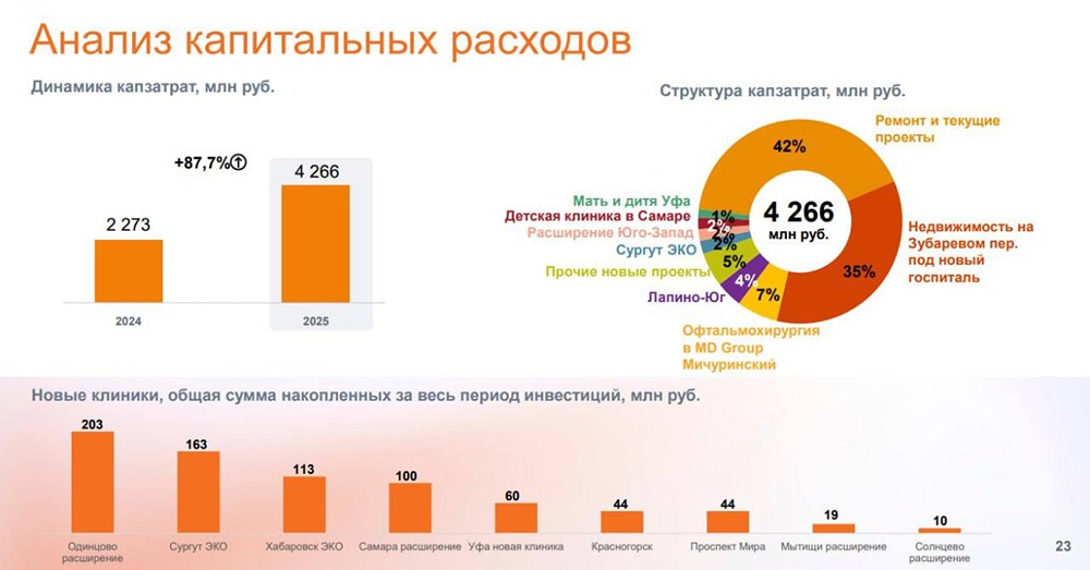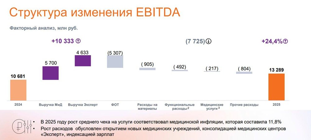 💥 Будущее уже здесь: «Мать и Дитя» на пороге перемен. Годовой отчет одной из любимых медицинских компаний вышел в свет. Давайте подведем итоги и посмотрим, за счет чего компания планирует расти в 2026 году. Рост и его качество Компания показала впечатляющий рост выручки на 39,5% до 24,2 млрд рублей, EBITDA увеличилась на 39,1%, а чистая прибыль — на 7,6% до 5,8 млрд рублей. Однако самое важное — это качество роста. Маржа не растет вместе с бизнесом: EBITDA margin снизилась до 30,6% в 2025 году против 32,2% годом ранее. Это связано с приобретением группы «Эксперт», которая имеет более низкую маржинальность, и с тем, что чистые финансовые доходы снизились из-за выплаты дивидендов и M&A. На конец 2025 года у компании было 2,7 млрд рублей денежных средств, а весь долг представлен арендными обязательствами. Чистый долг практически нулевой. Сеть «Эксперт», приобретенная в прошлом году, внесла 10,7% в общую выручку группы, а в четвертом квартале ее вклад вырос до 16%, что позволило значительно расширить присутствие на региональных рынках. Региональные амбулаторные клиники выросли на 84,6% за год и в 2,3 раза в четвертом квартале, а доля многопрофильных направлений в выручке достигла 47%. Базовый бизнес также растет: операции увеличились на 31%, койко-дни — на 2,7%. Таким образом, M&A не только не скрывает стагнацию, но и усиливает уже растущую платформу. Дивиденды и капитальные затраты Компания планирует направлять на выплаты не менее 60% чистой прибыли не реже двух раз в год. Во втором полугодии 2025 года выплата может составить еще 45 рублей. Общий объем капитальных затрат составил 4,26 млрд рублей, что на 87,7% больше, чем годом ранее. Планы на будущее В ближайшие два года компания планирует потратить более 10 млрд рублей на проекты, которые будут стимулировать рост выручки. Основные направления: 1. Женские центры: строительство уже ведется, и планируется их открытие в 2026 году. В 2027 году в Москве откроются гигантские многопрофильные центры. 2. Новые M&A сделки: переговоры уже ведутся. Компания готова привлекать долговое финансирование при необходимости. Заключение Отчет вышел положительным. Компания вкладывает деньги в рост и стабильно выплачивает дивиденды. Это делает ее предсказуемой и надежной. Не является индивидуальной инвестиционной рекомендацией Источник: Уютный разбирает