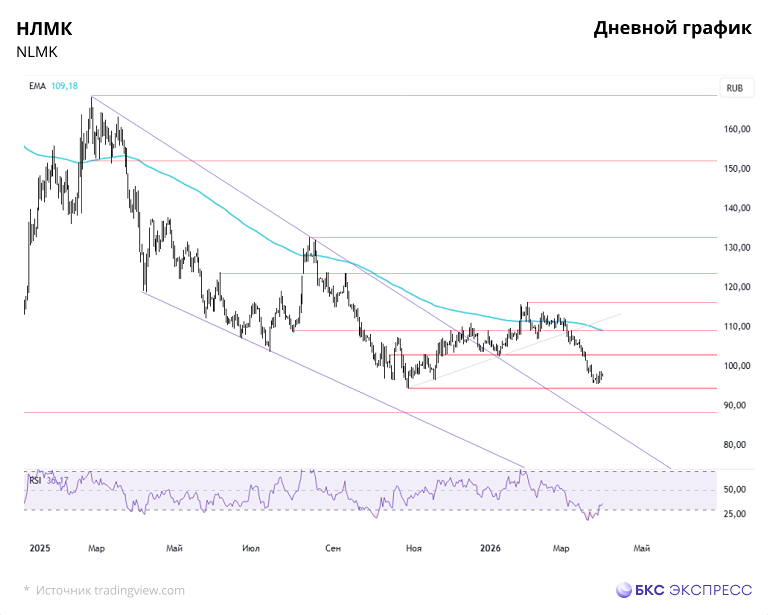 📣 Мнение БКС Экспресс. Акции НЛМК 2 апреля подешевели на 0,33%, завершив день на уровне 97,78 руб. Объем торгов составил 0,52 млрд руб. Утром котировки выросли на 0,5%, достигнув 98,2 руб. Краткосрочная перспектива • В среду акции НЛМК отскочили от годовых минимумов. В четверг попытки продолжить рост оказались безуспешными, и день завершился небольшим снижением. • Утром акции растут. Препятствием для дальнейшего подъема служит 200-часовая скользящая средняя на уровне 98,9 руб. Прорыв этого уровня может усилить восходящую динамику и помочь преодолеть сопротивление на 100 руб. В этом случае перед инвесторами встанет новая задача — вернуться в боковой тренд с границами 103–107,5 руб. • Поддержка на данный момент находится в районе 96,6–95,6 руб. Если цена опустится ниже, внимание снова будет приковано к минимумам 2025 года на уровне 94,6 руб. Следующая линия поддержки расположена около 88,3 руб. Внешний фон • Индекс S&P 500 в четверг вырос на 0,11%. Утром фьючерсы теряют 0,1%. Азиатские индексы демонстрируют разнонаправленную динамику: японский Nikkei поднимается на 1,1%, гонконгский Hang Seng и китайский Shanghai Composite снижаются на 0,7% и 0,9% соответственно. Цены на нефть Brent выросли на 8%, до 109,2 доллара за баррель. ❗️ Уровни сопротивления: 98,9 / 100 / 103 ❗️ Уровни поддержки: 95,6 / 94,6 / 88,3 Долгосрочная перспектива • Ослабление денежно-кредитной политики и улучшение геополитической обстановки в конце 2024 года поддержали акции НЛМК. На максимумах 2025 года они поднимались выше 168 руб. Впоследствии, из-за общерыночной нестабильности и падения цен на сталь, котировки снизились. • В июле 2025 года начался отскок, и акции вышли из нисходящего тренда. Попытки преодолеть 200-дневную скользящую среднюю завершились падением, что привело к новым годовым минимумам. Осенью котировки удалось стабилизировать, но сейчас они снова приближаются к этим уровням. Задача покупателей — вернуть 200-дневную скользящую среднюю в качестве поддержки. Это откроет путь к пиковым значениям лета 2025 года на уровне 132,7 руб. 🔥 В стратегии на второй квартал целевая цена остается на уровне 120 руб. Однако недавняя динамика акций изменила прогноз на «нейтральный». Стоит отметить, что НЛМК выиграет от постепенного восстановления сталелитейной отрасли во второй половине 2026 года. Этому могут способствовать снижение ключевой ставки и возможное ослабление рубля. Автор: Попова Анастасия Не является индивидуальной инвестиционной рекомендацией Источник: bcs-express.ru