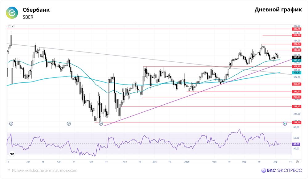 📣 Мнение БКС Экспресс. Акции Сбербанка в пятницу потеряли 0,51%, завершив торги на отметке 314,65 руб. Объем торгов был средним — 4,7 млрд руб. Сегодня утром бумаги слегка выросли на 0,1%. Краткосрочная картина • В пятницу акции Сбера снизились на фоне умеренной торговой активности. Большинство российских акций также двигались вниз. Индекс МосБиржи упал на 0,49% за основную сессию и завершил день в минусе на 0,52% по сравнению с закрытием четверга. • Утром акции Сбера немного выросли, но затем начали снижаться до конца дня. На дополнительной сессии они стабилизировались ниже 315 руб. • День завершился черной свечой со средней амплитудой и обновлением минимума предыдущего дня. Это умеренно негативный сигнал. На выходных динамика рынка была нейтральной. • На прошлой неделе активная нисходящая динамика в акциях Сбера прекратилась. Однако общая слабость рынка и бумаг банка сохраняется. • Глубокая просадка маловероятна, так как привлекательность акций будет расти по мере приближения к дате выплаты дивидендов. • Однако текущие уровни пока не кажутся привлекательными для покупок или продаж. Динамика бумаг вялая, они консолидируются в узком диапазоне. RSI находится около 50. • Индекс Мосбиржи пробил 200-дневную EMA, но еще не достиг более значимой поддержки на уровне 2710 пунктов. Снижение может продолжиться, что снижает вероятность роста отдельных бумаг. Рекомендации В текущих условиях рекомендуем придерживаться ранее озвученной стратегии: фиксировать прибыль частями в диапазоне 322–330 руб. Возвращаться к покупкам безопаснее при снижении до 308–312 руб. Внешний фон Рынки США в пятницу были закрыты. Фьючерс на S&P 500 утром вырос на 0,3%. Азиатские рынки растут. Фьючерс на Brent на Мосбирже подскочил на 3,55% по сравнению с закрытием четверга. На мировых площадках нефть утром упала на 0,7% до $107,2 за баррель. ❗️ Уровни сопротивления: 319, 322,1, 327 ❗️ Уровни поддержки: 310, 300,4, 296,2 Долгосрочная картина Акции Сбербанка торгуются на 19% ниже исторического максимума. Геополитическая ситуация в феврале 2022 года привела к пробою многолетнего тренда, начавшегося в 2014 году. • Опора найдена на пологом растущем тренде, берущем начало с минимумов 2009 года. Акции уверенно росли до середины 2024 года, после чего началась коррекция. • Снижение удалось остановить в декабре 2024 года благодаря решению ЦБ не повышать ключевую ставку. Среднесрочный тренд изменился на восходящий. • Ближайшая среднесрочная цель — закрепление выше максимумов 2024 года на уровне 330 руб. • За прошлую неделю акции Сбера прибавили символически и закрылись нейтральной свечей «Доджи». Это сигнал на продолжение снижения, но также указывает на слабое желание продавать бумаги на текущих уровнях. 🔥 Аналитики БКС сохраняют позитивный взгляд на акции Сбербанка. Цель на год — 420 руб. Автор: Решетников Олег Не является индивидуальной инвестиционной рекомендацией Источник: bcs-express.ru