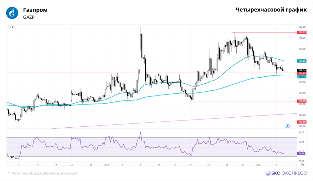 📣 Мнение БКС Экспресс. Акции Газпрома в пятницу снизились на 0,72% и закрылись на уровне 133,02 руб. Объем торгов составил 4,7 млрд руб., что ниже среднего. Сегодня утром акции немного выросли, прибавив 0,1%. Краткосрочная перспектива • В пятницу акции Газпрома подешевели на фоне низкой торговой активности. Большинство российских бумаг также снизились. Индекс МосБиржи упал на 0,49% за основную сессию и на 0,52% за весь день. • Закрытие пятницы прошло с небольшой черной свечой и заметной тенью сверху. Минимумы предыдущего дня повысились лишь символически, а в выходные падение продолжилось. Это умеренно негативный сигнал. • После быстрого подъема в конце марта акции вышли из затяжного бокового движения, но к концу месяца начался откат. Сейчас они тестируют верхнюю границу пробитого боковика, которая служит важной поддержкой. Рядом проходит 50-дневная скользящая средняя. • Если акции преодолеют уровень поддержки 130,9–131,8 руб., учитывая слабость рынка, они могут упасть в зону 126,6–128,2 руб. В этом диапазоне нисходящая динамика может приостановиться. • Сейчас более безопасны покупки в районе 200-дневной скользящей средней и вблизи октябрьской восходящей линии, то есть в диапазоне 126,6–128,2 руб. Внешний фон • Рынки США в пятницу были закрыты. Фьючерс на S&P 500 утром вырос на 0,2%. Азиатские индексы поднимаются. Фьючерс на нефть Brent на Мосбирже вырос на 3,55%, но на мировых рынках она подешевела на 0,4% до $107,5. ❗️ Уровни сопротивления: 139,07 / 144,4 / 150 ❗️ Уровни поддержки: 131,85 / 126,6 / 122,8 Долгосрочная перспектива • Акции Газпрома не имеют долгосрочных трендов — последний был утерян в прошлом году. Сейчас они движутся в боковом направлении, что может продолжаться долго. Можно выделить блок консолидации с границами 130–155 руб., где они торговались в 2013-2017 годах. Более широкий диапазон с учетом выбросов — 110–170 руб. Сейчас акции находятся ближе к нижней границе глобального боковика. • На прошлой неделе акции Газпрома закрылись черной свечой, полностью нивелировав рост предыдущей недели. Продавцы перехватили инициативу. Сейчас они находятся вблизи поддержки на старшем таймфрейме. Возможен ложный пробой этой зоны с последующим ростом. 🔥 Аналитики БКС оценивают акции Газпрома как «нейтральные» и видят цель на уровне 160 руб. к концу года. Автор: Решетников Олег Не является индивидуальной инвестиционной рекомендацией Источник: bcs-express.ru