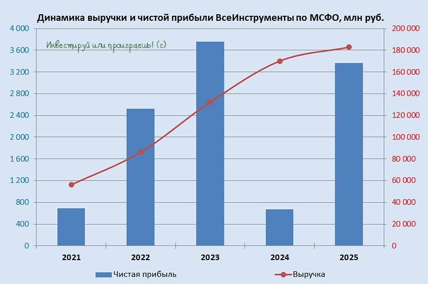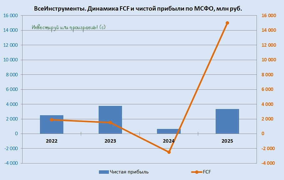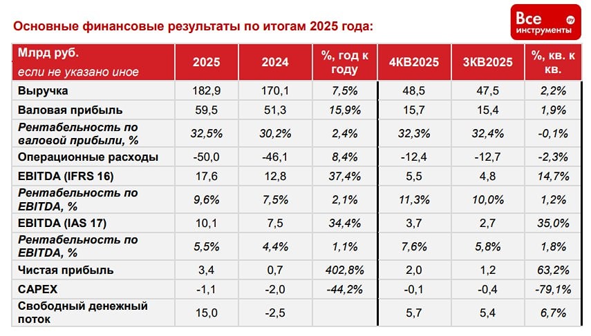 🔴 Амбиции на фоне стагнации рынка. В 2025 году отечественный рынок DIY замедлился вдвое, но компания ВсеИнструменты обещает рост прибыли в ближайшие три года. Насколько реалистичны эти планы? Разберёмся, опираясь на свежий отчёт компании. Выручка ВсеИнструменты выросла на 7,5% до 182,9 млрд руб. Это произошло благодаря увеличению среднего чека, хотя количество заказов сократилось. По данным агентства INFOLine, рынок DIY вырос на 13,2%, но крупнейшие игроки показали разные результаты. Маркетплейсы Wildberries, Ozon и Яндекс Маркет увеличили обороты на 42,5%, а специализированные DIY-сети, включая ВсеИнструменты, столкнулись с трудностями. Например, Лемана ПРО потеряла 6% доходов, а Петрович едва удержался в плюсе. Тренды отрасли стали очевидны несколько лет назад, когда маркетплейсы начали набирать популярность. Физические лица предпочитают электронные площадки, а юридические — специализированные сети с дополнительными услугами. Операционные результаты ВсеИнструменты мы уже разбирали. Давайте посмотрим на EBITDA, которая выросла на 34,4% до 10,1 млрд руб. В условиях жёсткой денежно-кредитной политики компания оптимизировала издержки и улучшила операционные доходы. Чистая прибыль выросла в 5 раз — до 3,4 млрд руб. Хотя частично это связано с разовыми расходами на IPO в 2024 году, результат впечатляет. До рекордных 3,8 млрд руб. 2023 года осталось немного. Компания сократила долг на 15 млрд руб., достигнув чистой денежной позиции в 1,8 млрд руб. Это важное конкурентное преимущество в условиях жёсткой ДКП. Баланс компании крепкий, а свободный денежный поток составил 15 млрд руб. (ранее был отрицательным). Это позволяет рассмотреть выплату дивидендов за 2025 год в размере 3 руб. на акцию. С учётом ранее выплаченных 1 руб. и 2 руб., итоговая сумма составит 6 руб. на акцию и годовая доходность — 7,9%. Это 6 млрд руб. дивидендов при рекордном FCF в 15 млрд руб. На конференц-звонке менеджмент ВсеИнструменты озвучил прогноз по чистой прибыли на 2026 год в диапазоне 3,4–6,0 млрд руб. Верхняя граница предполагает рост на 76% и обновление исторических максимумов. Это базовый сценарий, если не реализуются риски по текущим проектам. Как компания планирует добиться таких результатов на фоне стагнации рынка DIY? Стратегия включает: ➥ Увеличение доли собственных торговых марок — более маржинального направления. ➥ Рост процентных доходов благодаря отрицательному чистому долгу. ➥ Оптимизацию складской логистики для снижения издержек. Компания не планирует существенно увеличивать капитальные затраты в 2026 году, что, вероятно, позволит продолжить дивидендную политику. ВсеИнструменты продемонстрировали умение адаптироваться к сложным условиям, оптимизировав бизнес-процессы и укрепив баланс. На коррекциях можно осторожно добавлять их бумаги в портфель. У меня уже есть небольшая доля в размере 0,25%. Не является индивидуальной инвестиционной рекомендацией Источник: Инвестируй или проиграешь | Юрий Козлов