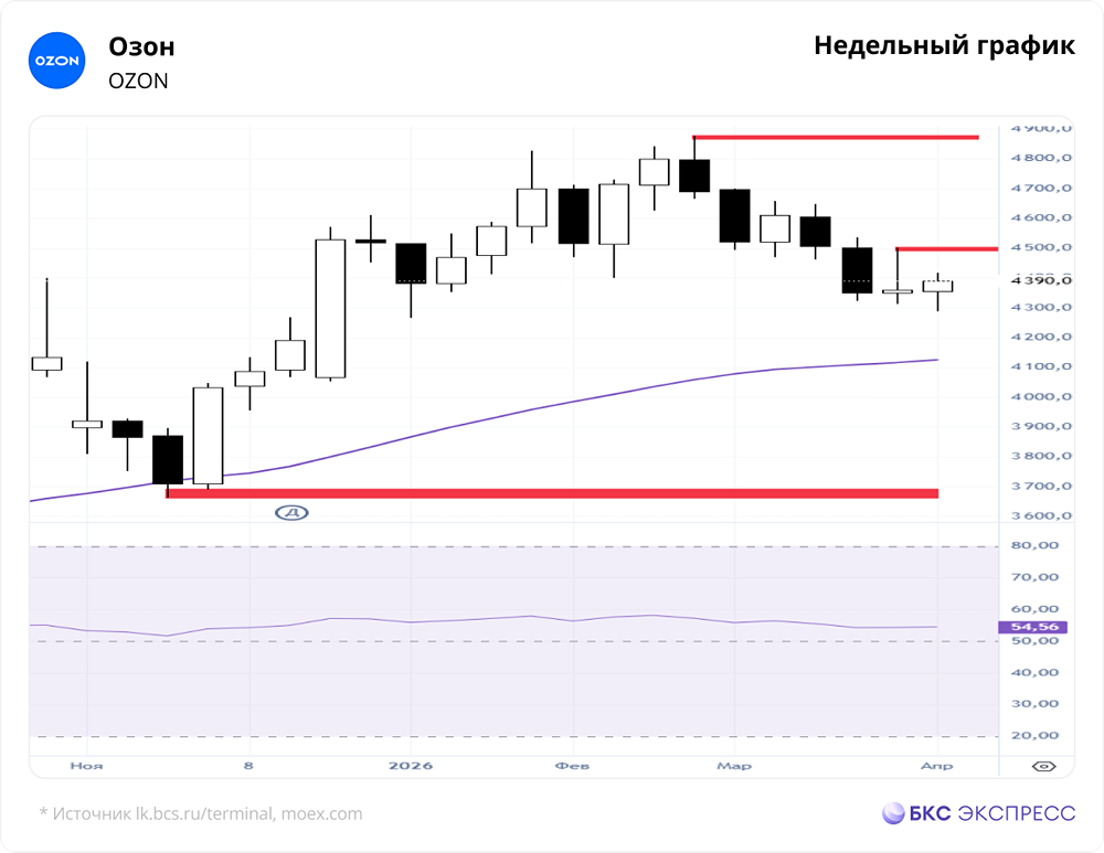 📣 Мнение БКС Экспресс. Акции Озона на прошлой торговой сессии выросли на 0,46%, закрывшись на уровне 4379 рублей. Бумаги отставали от рынка, объем торгов составил 1,48 млрд рублей. Краткосрочная перспектива • На дневном графике сформировались первые цели падения — 4225–4202. Текущий минимум находится на уровне 4288,5 рублей. • Первый сигнал к возобновлению роста — пробой уровня сопротивления 4500,5 рублей. Пока нет пробоя отметки 4648 рублей, инициатива остается у продавцов. • На дневном графике индекс RSI находится на уровне 45 пунктов. На 4-часовом таймфрейме котировки находятся между 50- и 200-дневной скользящей средней. Основное внимание уделяем уровням сопротивления и поддержки: 4500,5 и 4265 рублей. Внешний фон • Индекс S&P 500 в понедельник вырос на 0,72%, но утром потерял 0,4%. АТР-индексы торгуются разнонаправленно. Цена на нефть Brent в понедельник поднялась на 0,68%, утром она выросла на 1,3%. ❗️ Уровни сопротивления: 4500,5 / 4648 / 4877 ❗️ Уровни поддержки: 4288,5 / 4265 / 3662,5 Долгосрочная перспектива • Для завершения первого импульса падения на недельном графике необходим пробой максимума предыдущей недели — 4500,5 рублей. • Если уровень 4500,5 будет пробит, откроется дорога к целям отскока — 4509–4624 рублей. • Локальные цели движения рассматриваем в краткосрочной перспективе. В долгосрочной перспективе следим за закрытием недельной свечи в конце пятничных торгов. • Озон является второй по величине площадкой электронной коммерции в России после Wildberries. Финансовые результаты за 2025 год по МСФО • Выручка за IV квартал выросла на 43%, до 309,4 млрд рублей, за год — на 63%, до 998 млрд рублей. • Скорректированный показатель EBITDA в IV квартале увеличился на 26,4 млрд рублей, до 43,2 млрд рублей, за год — на 116,3 млрд рублей, до 156,4 млрд рублей. • Прибыль в IV квартале составила 3,7 млрд рублей против убытка в 17,6 млрд рублей годом ранее. За год убыток сократился до 0,9 млрд рублей с 59,4 млрд рублей годом ранее. • Чистый денежный поток от операционной деятельности сократился на 10 млрд рублей, до 157,6 млрд рублей. За год он вырос на 217,3 млрд рублей, до 503,6 млрд рублей. • Число пунктов выдачи заказов Озона выросло на 40% год к году, до 84 тысяч. Прогноз на 2026 год • Компания планирует выйти на чистую прибыль. Оборот (GMV) с учетом услуг вырастет на 25–30% год к году. Скорректированный показатель EBITDA достигнет 200 млрд рублей. 🔥 Аналитики БКС имеют позитивный взгляд на акции Озона. Целевая цена на горизонте года составляет 6400 рублей за акцию. Автор: Мамонтов Андрей Не является индивидуальной инвестиционной рекомендацией Источник: bcs-express.ru