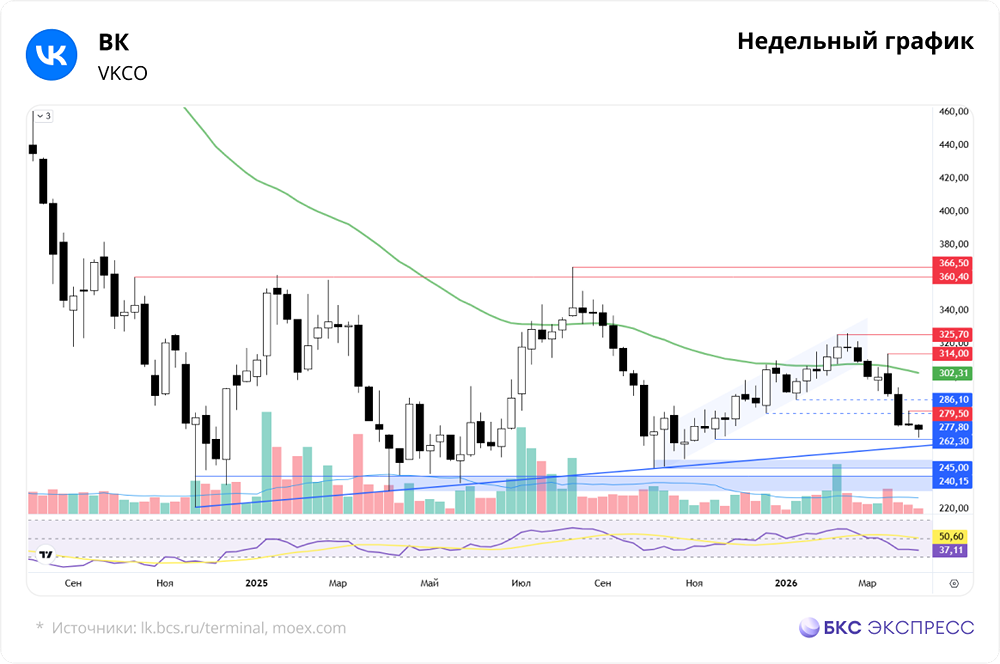 📣 Мнение БКС Экспресс. Акции VK во вторник упали на 0,69% и достигли 265,3 руб. Торги были умеренными — 579 млн руб. Утром в среду акции выросли на 0,8% от уровня закрытия вторника. Краткосрочная перспектива • Акции индекса МосБиржи в основном росли. Сам индекс вырос на 0,44% за основную сессию и на 0,11% на вечерних торгах относительно закрытия понедельника. • Переговоры по украинскому конфликту приостановлены. Существенного прогресса в урегулировании нет уже несколько недель. При этом рубль укрепляется после мартовского падения. • Рынки ждали развязки ситуации на Ближнем Востоке из-за истечения срока мирного договора, установленного президентом США. Эскалации не произошло, что вызвало коррекцию цен на нефть и газ. Сегодня ожидаем отток средств из нефтегазового сектора. • Акции VK падают шесть недель подряд с середины февраля 2026 года. На прошлой неделе закрытие было в нуле, но это не изменило негативную техническую картину. Снижение продолжается. • За две недели после последнего обзора акции VK пробили уровни поддержки на 286 и 278 руб. После кратковременного отскока около 270 руб. они продолжили падать и приближаются к поддержке на 262,3 руб. Восходящий тренд от ноября 2025 года остается важным уровнем. • Возможно, акции VK приостановят снижение и попытаются консолидироваться выше тренда от ноября 2025 года. Этому могут способствовать технические поддержки и отток ликвидности из нефтегазового сектора. Дальнейшее движение будет зависеть от решений ЦБ РФ на апрельском заседании. • Банк России может расширить возможности по монетарной политике на фоне дорогой нефти и укрепившегося рубля. При умеренной инфляции и снижении инфляционных ожиданий инвесторы ожидают снижения ключевой ставки. Иначе акции продолжат падать. Внешний фон • Во вторник S&P 500 вырос на 0,08%. Фьючерс на S&P 500 сегодня в плюсе на 2,41%. Азиатские индексы в основном растут. На мировых рынках нефть Brent падает на 13,4% до $94,7 за баррель. ❗️ Уровни сопротивления: 280, 296, 314. ❗️ Уровни поддержки: 262, 245, 231. Долгосрочная перспектива • С августа 2023 года началась коррекция от локального максимума. К концу 2024 года падение замедлилось, и в июле 2025 года нисходящий тренд был преодолен. С конца 2024 года сформировался широкий боковик 230–360, границы которого тестируются. • Февральская свеча закрылась в плюсе, но длинная верхняя тень дает негативный сигнал. Мартовский пробой 200-дневной средней и черная свеча подтверждают преимущество продавцов. • Акции VK часто движутся сильнее рынка из-за чувствительности к процентным ставкам и низкой рентабельности. Фундаментальная картина неоднозначна: господдержка, активность по IPO и SPO, развитие проекта национального мессенджера MAX. Однако осторожная политика ЦБ РФ и риски фискальных мер для IT-сектора ограничивают рост. • Финансовые результаты за 2025 год могли стать причиной снижения в I квартале 2026 года. Несмотря на лучший, чем ожидалось, отчет по EBITDA (22,6 млрд руб.), есть риски стагнации в 2026 году. Компания прогнозирует EBITDA выше 20 млрд руб., что означает околонулевой рост. Высокая долговая нагрузка и замедление роста рынка рекламы также негативно влияют на инвестиционный потенциал. 🔥 Целевая цена акций VK на год — 310 руб. Оценка: «Негативная». Не является индивидуальной инвестиционной рекомендацией Источник: bcs-express.ru