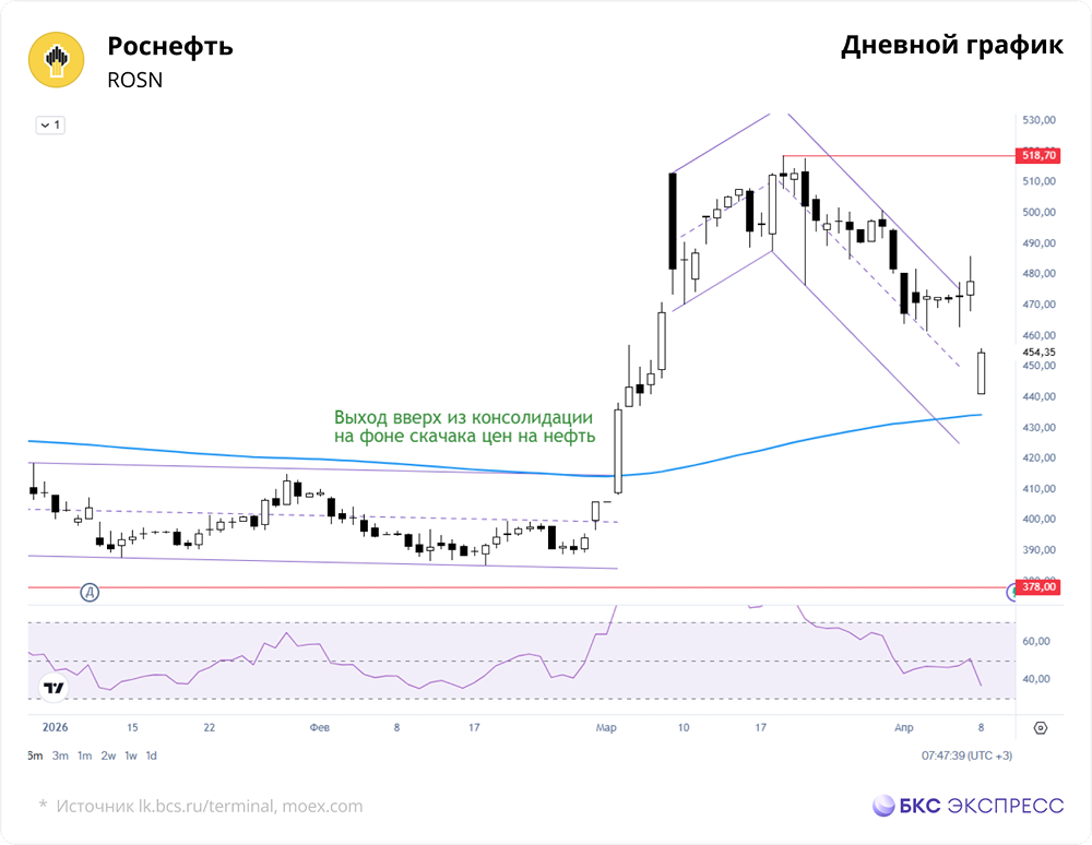 📣 Мнение БКС Экспресс. Вчера акции Роснефти подорожали на 0,97% до 477,7 рублей. Объем торгов составил 9,7 млрд рублей. На утренней сессии они упали на 4,71% до 455,2 рублей. Краткосрочная картина Умеренное повышение стоимости сопровождалось средним торговым оборотом. Акции компании обновили недельный максимум, но потеряли значительную часть прироста внутри дня. Сегодня они открылись с сильным разрывом вниз из-за резкого падения нефтяных котировок. Это связано с надеждами на снижение напряженности на Ближнем Востоке. Вчерашняя попытка сломать двухнедельный нисходящий тренд не удалась. Однако бумаги нашли прочную поддержку на уровне 440 рублей. Несмотря на вчерашние покупки, закрытие произошло ниже 200-часовой скользящей средней. Краткосрочная техническая картина остается позитивной, но ухудшилась из-за утреннего гэпа. Низкое значение индекса относительной силы (RSI) на часовом графике указывает на близость к состоянию перепроданности. Сегодня акции Роснефти отыграли часть утренней просадки и могут перейти в состояние волатильной консолидации в диапазоне 440–468 рублей. Среднесрочные перспективы остаются нейтральными. Сильный скачок цен на нефть может стать стимулом для значительного движения от текущего уровня. Внешний фон Индекс S&P 500 вырос на 0,08%. Фьючерсы на S&P 500 утром поднимаются на 2,6%. Большинство азиатских фондовых индексов растет. Нефть Brent подешевела на 14% до $94 за баррель. ❗️ Уровни сопротивления: 460, 468, 475. ❗️ Уровни поддержки: 450, 441, 437. Долгосрочная картина В конце октября акции Роснефти обновили минимум с мая 2023 года. После этого среднесрочный нисходящий тренд завершился. Позднее произошел резкий рост из-за скачка нефтяных цен на фоне конфликта с участием Ирана. Сейчас бумаги потеряли часть среднесрочного прироста, но остаются выше 200-дневной скользящей средней. Долгосрочная техническая картина остается нейтральной. 🔥 Аналитики БКС прогнозируют целевую цену акций Роснефти на конец года в 600 рублей (+32%). Их взгляд на бумагу — нейтральный. Автор: Манжос Виталий Не является индивидуальной инвестиционной рекомендацией Источник: bcs-express.ru