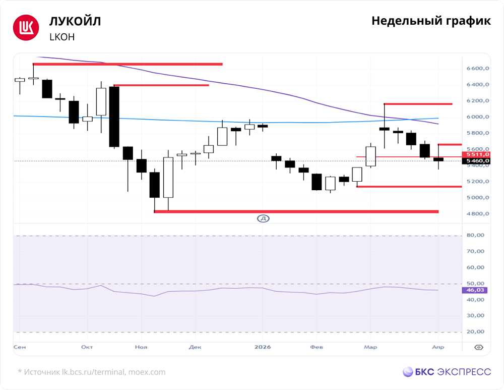 📣 Мнение БКС Экспресс. Акции ЛУКОЙЛа выросли на 0,27% на прошлой торговой сессии, закрывшись на уровне 5591,5 руб. Однако бумаги торговались хуже рынка, объем торгов составил 4,18 млрд руб. Краткосрочная перспектива Сегодня утром акции открылись с гэпом вниз на фоне резкого падения нефтяных цен. Причиной стало сообщение о перемирии между США и Ираном, что открывает Ормузский пролив. Текущий минимум достиг 5352,5 руб. На дневном графике наблюдается новый импульс падения с максимума 5668. Вероятно, снижение продолжится до уровня 5340–5315. На дневном графике RSI находится на уровне 45 пунктов, а на 4-часовом акции торгуются ниже 50- и 200-дневной скользящих средних. Основное внимание уделяется уровням сопротивления и поддержки: 5668 и 5352,5. Внешний фон Индекс S&P 500 вырос на 0,09% во вторник и на 2,6% с утра. Индексы Азиатско-Тихоокеанского региона в плюсе. Нефть Brent упала на 0,46% и на 15% с утра. ❗️ Уровни сопротивления: 5668, 5729,5, 5874 ❗️ Уровни поддержки: 5352,5, 5132,5, 5055 Долгосрочная перспектива На недельном графике структура роста достигла цели ускорения 5659. Учитывая выполнение всех целей, ожидается завершение отката и формирование новых трендов. Пока поддержка 5132,5 не сломана, долгосрочный тренд остается бычьим. Совет директоров ЛУКОЙЛа рекомендовал выплатить 278 руб. на акцию в качестве финальных дивидендов за 2025 год. Реестр для получения дивидендов закроется 4 мая 2026 года. Окончательное решение будет принято на собрании акционеров 23 апреля 2026 года. 🔥 Аналитики БКС считают акции ЛУКОЙЛа нейтральными. Целевая цена на год — 6500 руб. Автор: Мамонтов Андрей Не является индивидуальной инвестиционной рекомендацией