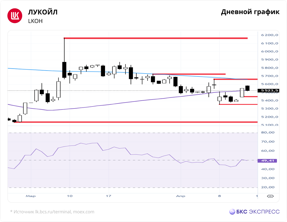 📣 Мнение БКС Экспресс. Акции ЛУКОЙЛа в прошлую пятницу подешевели на 0,92% и закрылись на уровне 5392 руб. Торги проходили хуже рынка, объем составил 1,96 млрд руб. Краткосрочная перспектива • На дневном графике акции пробились ниже уровня 5418,5, что сформировало первый импульс падения с максимумом 5668. Локальный максимум в понедельник был на отметке 5587,5. • В ближайшее время следим за сопротивлением на уровне 5668. До тех пор пока этот уровень не будет пробит, цена может продолжить снижение к следующей области 5340–5315. Для нового падения с текущих уровней необходим слом поддержки на 5444. • На дневном графике RSI находится на уровне 49 пунктов. На 4-часовом таймфрейме акции торгуются между 50- и 200-дневной скользящими средними. В первую очередь следим за уровнями 5668 и 5444. Внешний фон • Индекс S&P 500 в пятницу потерял 0,12%, утром был в минусе на 0,6%. Азиатские индексы торгуются разнонаправленно. Нефть Brent снизилась на 0,75%, но утром выросла на 6,9%. ❗️ Уровни сопротивления: 5668 / 5729,5 / 5874 ❗️ Уровни поддержки: 5444 / 5352,5 / 5132,5 Долгосрочная перспектива • На недельном графике структура роста достигла цели ускорения 5659. После достижения всех целей ожидается завершение коррекции и формирование новых трендов. • Пока поддержка на уровне 5132,5 не сломана, долгосрочный тренд остается бычьим. • Совет директоров ЛУКОЙЛа рекомендовал выплатить 278 руб. на акцию в качестве финальных дивидендов за 2025 год. Реестр для получения дивидендов закроется 4 мая 2026 года. Окончательное решение по дивидендам будет принято на собрании акционеров 23 апреля 2026 года. 🔥 Аналитики БКС оценивают акции ЛУКОЙЛа как «нейтральные». Целевая цена на год — 6500 руб. Автор: Мамонтов Андрей Не является индивидуальной инвестиционной рекомендацией Источник: bcs-express.ru