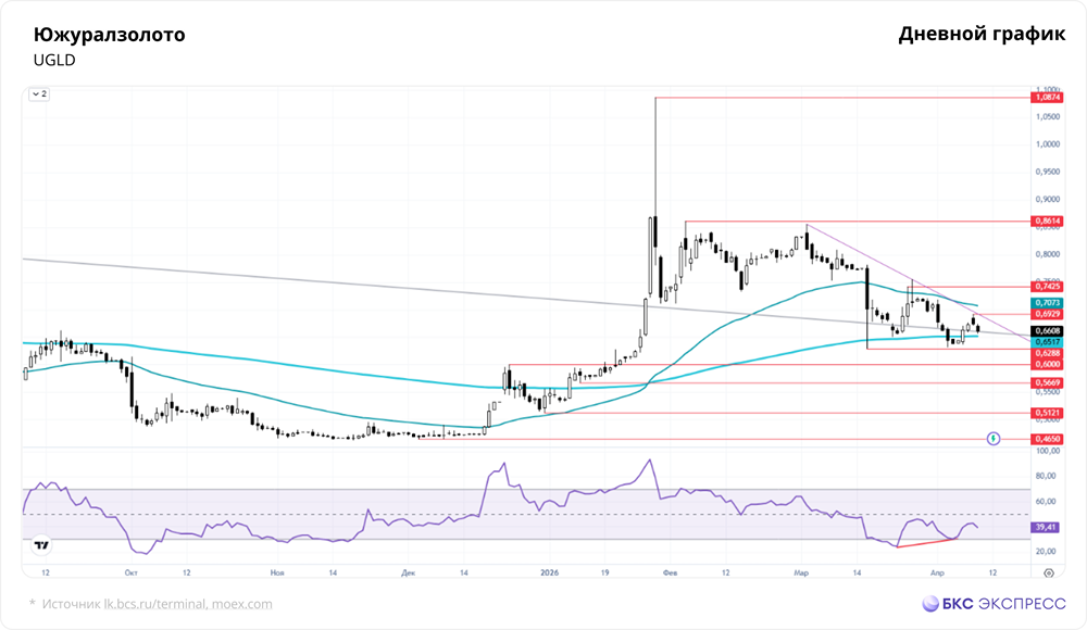 📣 Мнение БКС Экспресс. В четверг акции Южуралзолота подешевели на 1,93%, закрывшись на уровне 0,6608 руб. Объем торгов был низким — 0,22 млрд руб. С утра акции росли на 0,7%. Краткосрочная перспектива • Акции Южуралзолота значительно снизились в цене на фоне низкой торговой активности. Российские акции также показали снижение. Индекс МосБиржи упал на 1,15% по итогам основной сессии и на 0,91% по вечернему бенчмарку. • Акции компании-золотодобытчика планомерно снижались весь день и закрылись с потерями. • В четверг сформировалась черная свеча с небольшой амплитудой. Закрытие произошло вблизи минимумов, при этом обновив экстремумы предыдущего дня. Сигнал умеренно негативный. • Общая динамика остается слабой из-за ареста средств компании. Это повышает риски при торговле акциями. • Амплитуда колебаний снижается, и акции стабилизируются около 200-дневной EMA (скользящей средней). На дневном RSI наблюдается бычья дивергенция, что может указывать на возможный отскок. • Сильная поддержка находится на уровне 0,6–0,629 руб., а ближайший значимый уровень сопротивления — в диапазоне 0,72–0,743 руб. • Котировки акций могут испытывать дополнительное давление из-за слабой динамики широкого рынка. Индекс МосБиржи закрылся слабой свечой, сигнализируя о возможном снижении до 2675–2710 пунктов. Это создает неблагоприятные условия для роста отдельных акций. Внешний фон • В четверг S&P 500 вырос на 0,62%, утренние фьючерсы на индекс были в плюсе на 0,1%. Азиатские индексы растут. Фьючерсы на нефть Brent на Мосбирже потеряли 0,04%, а на мировых площадках нефть подорожала на 0,2% и составляет $4770 за баррель. Фьючерсы на золото на Мосбирже выросли на 0,96%, но на мировых рынках цена снизилась на 0,1% и составляет $4770 за унцию. ❗️ Уровни сопротивления: 0,693 / 0,742 / 0,861 ❗️ Уровни поддержки: 0,629 / 0,6 / 0,567 Долгосрочная перспектива • Нисходящий тренд, начавшийся в апреле 2024 года, был прорван в конце января, но затяжного роста не последовало. Долгосрочные тренды отсутствуют. • Прошлую неделю акции завершили черной свечой с амплитудой, обновив минимум предыдущей недели. Сигнал негативный, но рядом находится значимая поддержка, а сигналы на младших таймфреймах указывают на возможность разворота. 🔥 Аналитики БКС считают перспективы акций Южуралзолота негативными. Целевая цена на год — 0,85 руб. Автор: Решетников Олег Данный материал носит информационный характер и [не является индивидуальной инвестиционной рекомендацией](https://mondiara.com/communities?open=community-1163) или предложением о покупке или продаже указанной ценной бумаги. Источник: bcs-express.ru