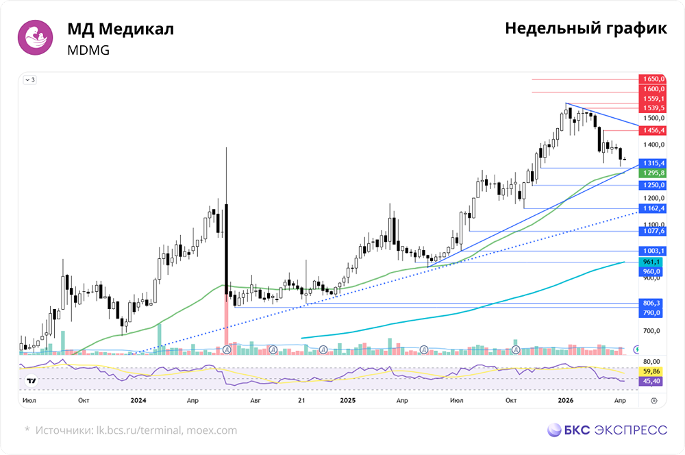 📣 Мнение БКС Экспресс. Акции МД Медикал («Мать и дитя») в пятницу остались на уровне 1339,1 руб. В выходные они выросли на 0,73% до 1348,9 руб., но объем торгов был ниже среднего — всего 97 млн руб. Утром в понедельник бумаги потеряли 0,1% относительно закрытия воскресенья. Краткосрочная картина • Акции индекса МосБиржи в пятницу показали смешанную динамику, но преимущественно снизились. Индекс упал на 0,29% за основную сессию и еще на 0,75% на вечерних торгах. • На прошлой неделе ухудшились рыночные настроения из-за обсуждения налога на сверхприбыль, начатого в марте. Дополнительное давление оказали данные по инфляции за март, оказавшиеся хуже прогнозов, и укрепление рубля. • Перед текущей неделей ожидалось завершение переговоров между США и Ираном. Сделка не была достигнута, и Дональд Трамп объявил о блокаде Ормузского пролива. Это привело к росту геополитической премии: фьючерсы на Brent поднялись выше $100, золото потеряло около 1%, а фьючерсы на S&P 500 снизились на 0,7%. • Акции «Мать и дитя» с 13 марта по 7 апреля консолидировались около уровня 1400 руб., но затем усилилась активность продавцов. Это привело к пробою важной поддержки — 200-дневной скользящей средней. В последующие дни котировки пытались вернуться к этому уровню, но не смогли. Закрытие недели ниже EMA 200 стало первым случаем с декабря 2024 года. • Снижение бумаг ниже важной поддержки после хорошего отчета — негативный сигнал. Возможно, это связано с затратами на M&A. Однако краткосрочное снижение дивидендов компенсируется долгосрочными синергетическими эффектами. • В ближайшее время ожидается рост ликвидности в акциях нефтегазовых компаний. На фоне слабости бумаг «Мать и дитя» возможен откат к поддержке 1315 руб. Ниже проходит восходящий тренд от мая 2025 года и поддержка от минимумов ноября 2025 года на уровне 1250 руб. Внешний фон • В пятницу S&P 500 снизился на 0,11%. Сегодня фьючерс на индекс упал на 0,7%. Индексы азиатских рынков в основном в минусе. На мировых рынках нефть Brent растет на 7,3% и достигает $102,1 за баррель. ❗️Уровни сопротивления: 1400, 1456, 1500 ❗️Уровни поддержки: 1315, 1250, 1162 Долгосрочная картина • Бумаги продолжают восходящий тренд, начавшийся в сентябре 2022 года. После пробоя 200-дневной скользящей средней котировки вышли на опережающую траекторию роста. В начале 2026 года ожидается локальный максимум в районе 1560 руб. Текущая консолидация — первая после обновления исторических максимумов в конце 2025 года. • После «Доджи» в январе 2026 года февраль закрылся в красной зоне. Это реализовало риск продолжения нисходящего тренда. • В марте компания опубликовала хорошую отчетность по МСФО за 2025 год. Выручка выросла на 31% до 43 млрд руб., EBITDA — на 24% до 13 млрд руб., чистая прибыль — на 8,5% до 11 млрд руб. Рентабельность чистой прибыли составила 25% против 31% годом ранее. Менеджмент подтвердил приверженность регулярным выплатам дивидендов, несмотря на сделки M&A. • Фундаментальная картина компании остается сильной. Низкая зависимость от внешнего фона позволяет игнорировать большинство рыночных потрясений. Однако 80% выручки зависит от платежей пациентов, благосостояние которых связано с экономическим ростом. Около 20% выручки приходится на процедуры ЭКО, государственное субсидирование которых может сократиться из-за дефицита бюджета. 🔥 Целевая цена аналитиков БКС на год — 1700 руб. Прогноз — «Нейтральный». Авт