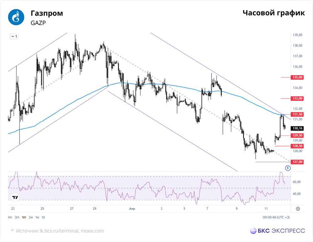 📣 Мнение БКС Экспресс. Вчера акции Газпрома выросли в цене на 2,71% по сравнению с пятничным закрытием, достигнув 131,3 рубля. Объем торгов составил 3,2 миллиарда рублей. На утренней сессии рост замедлился до 2,06% или 130,47 рубля. Краткосрочная перспектива • Заметное повышение стоимости в выходные сопровождалось низким торговым оборотом. Акциям Газпрома способствовал спрос на фоне опасений эскалации конфликта на Ближнем Востоке. Сейчас они пытаются вернуться в границы трехмесячного восходящего канала, что было бы позитивно. Однако рост связан с ценами на нефть и может быть неустойчивым. Среднесрочная поддержка находится около 127 рублей. • Хотя закрытие прошло ниже 200-часовой скользящей средней, техническая картина остается позитивной. Высокий утренний уровень индикатора относительной силы (RSI) на часовом графике указывает на перекупленность. • Утром акции Газпрома отступили от краткосрочного максимума и, вероятно, перейдут в состояние консолидации в диапазоне 129–132 рубля. Они остаются чувствительными к рыночной конъюнктуре и внешнеполитическим событиям. Внешний фон • Индекс S&P 500 в пятницу снизился на 0,11%. Фьючерсы на S&P 500 утром теряют 0,7%. Азиатские рынки демонстрируют разнонаправленную динамику. Нефть Brent растет на 7,3%, до 102,2 доллара за баррель. ❗️Уровни сопротивления: 131,5, 133, 135 ❗️Уровни поддержки: 129,5, 128,5, 127 Долгосрочная перспектива • У акций Газпрома нет долгосрочных трендов — последний был утерян в прошлом году. Динамика остается боковой, что может продолжаться долго. Наблюдается блок консолидации в диапазоне 130–155 рублей, где акции торговались в 2013–2017 годах. Более широкий диапазон с учетом выбросов — 110–170 рублей. Сейчас котировки находятся ближе к нижней границе этого диапазона. • Существенный рост затруднен из-за множества старых технических сопротивлений и ухудшения фундаментальных факторов, включая снижение поставок газа в западном направлении. В 2023 году Газпром впервые за 25 лет зафиксировал годовой убыток, отказался от дивидендов и пока не возобновил их выплату. 🔥 Аналитики БКС оценивают акции Газпрома как «нейтральные», прогнозируя цель на уровне 160 рублей (+23%) в течение года. Автор: Манжос Виталий Данный материал носит информационный характер и [не является индивидуальной инвестиционной рекомендацией](https://mondiara.com/communities?open=community-1163) или предложением о покупке или продаже указанной ценной бумаги. Источник: bcs-express.ru