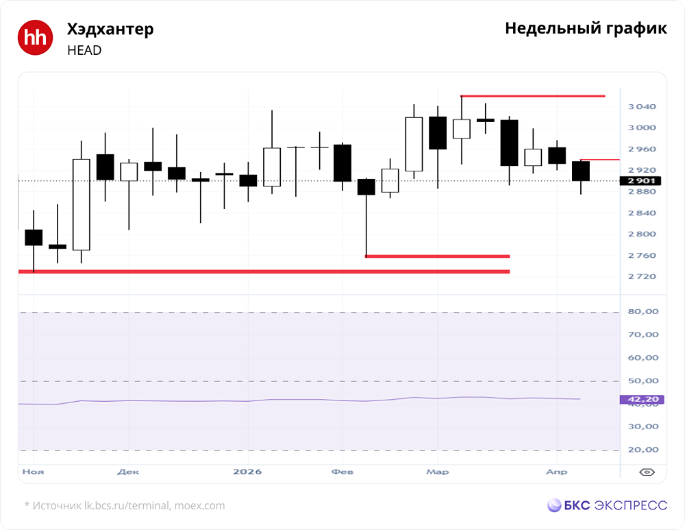 Мнение БКС Экспресс. Акции HeadHunter на прошлой торговой сессии снизились на 0,62%, закрывшись на уровне 2894 рубля. Бумаги показали ухудшение динамики по сравнению с рынком, объем торгов составил 0,3 миллиарда рублей. Краткосрочная перспектива • На дневном графике акции достигли максимальных уровней падения 2888–2870. Текущий минимум находится на отметке 2874 рубля. Пока не произошел прорыв уровня 2940, инициатива остается за продавцами. • Триггером для начала роста станет пробой уровня 2916. В этом случае возможен слом сопротивления на уровне 2940 и движение к 2970–2976 рублям. • На дневном графике RSI находится на уровне 40 пунктов. На 4-часовом таймфрейме акции торгуются ниже 50- и 200-дневной скользящих средних. Основное внимание уделяется уровням сопротивления и поддержки: 2940 и 2874 рубля. Внешний фон Индекс S&P 500 вырос на 1,18% во вторник, утром прибавляя 0,1%. Индексы Азиатско-Тихоокеанского региона (АТР) торгуются разнонаправленно. Нефть марки Brent снизилась на 4,6% во вторник, утром теряя 0,1%. Уровни сопротивления: 2940, 2977, 3061 Уровни поддержки: 2874, 2867, 2756 Долгосрочная перспектива • На недельном графике структура роста с целями 3114–3131 была отменена из-за слома поддержки на уровне 2886. Ждем завершения волны падения и формирования новой структуры для оценки будущих целей. • Краткосрочные и среднесрочные движения анализируем в рамках краткосрочной картины. В долгосрочной перспективе важно следить за закрытием недельной свечи в конце торгов пятницы. • Сохраняем позитивный взгляд на HeadHunter и повышаем целевую цену на 12 месяцев до 4900 рублей за акцию. HeadHunter остается нашим фаворитом в секторе ИТ. Выручка компании за четвертый квартал 2025 года по МСФО составила 10,5 миллиарда рублей, что практически не изменилось по сравнению с аналогичным периодом прошлого года. За год выручка выросла на 4%. • HeadHunter рекомендовал выплату дивидендов за второе полугодие 2025 года в размере 233 рубля на акцию. Дивидендная доходность может составить 7,8%. Решение акционеров будет принято на годовом собрании 27 апреля. Выплата ожидается в конце мая и должна поддержать акции. Автор: Мамонтов Андрей Данный материал носит информационный характер и [не является индивидуальной инвестиционной рекомендацией](https://mondiara.com/communities?open=community-1163) или предложением о покупке или продаже указанной ценной бумаги. Источник: bcs-express.ru