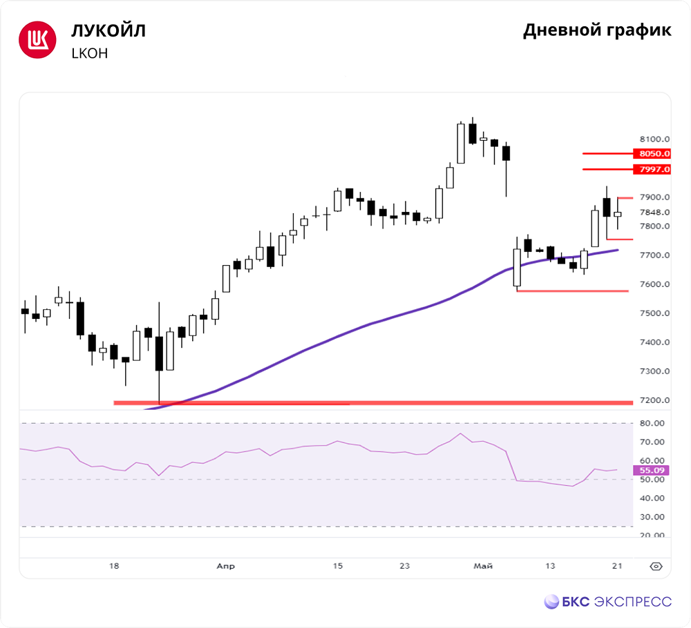 Мнение: БКС Мир Инвестиций. ЛУКОЙЛ. Нужен тест сопротивления 7900. Акции компании ЛУКОЙЛ на прошлой торговой сессии выросли на 0,17%. Цена на закрытии составила 7848 руб. Бумаги торговались лучше рынка. Объем торгов достиг 6,04 млрд руб. Краткосрочная картина: - Во вторник попытки снижения были выкуплены. Максимум внутри дня установлен на отметке 7900. Ранее акции сломали сопротивление 7871,5. За счет этого актуально движение в область 7997–8050. - Техническая картина часового графика на стороне покупателей. Сегодня допускается тест сопротивления 7900, но пробить с первого раза боковик 7752–7938 будет сложно. Проторговка для набора сил может продолжиться. - Часовая структура указывает на первые цели роста 8025–8053. Сценарий актуален, пока нет слома поддержки 7752. - На дневном графике кривая RSI на отметке 55 п. На 4-часовом графике акции торгуются выше 50- и 200-дневной скользящей средней. В первую очередь следим за уровнями сопротивления и поддержки: 7900 и 7752. Внешний фон. Внешний фон с утра нейтральный. Фьючерс на индекс S&P 500 торгуется возле 0. Индексы АТР торгуются разнонаправленно. Нефть Brent в минусе на 0,6%. Уровни сопротивления: 7900 / 8050 / 8175 Уровни поддержки: 7752 / 7574 / 7184,5 Долгосрочная картина: - Сейчас на недельном графике сформировалось ускорение роста с минимумом 7184,5. Текущий ориентир целей восходящего движения: 8545–8660 и 8895–9025. В ближайшие недели допускается касание зоны 7458–7561 со сломом поддержки 7574. Если это произойдет, цели роста будут пересчитаны. - Ранее долгосрочные цели роста совпадали с дневной структурой: первые - 7780–7844 (выполнены), основные - 8082–8169 (выполнены). - Бумаги очистились от дивидендов за 2023 г. Акционерам на 6 мая будет выплачено 498 руб. на акцию, дивидендная доходность - 6,1%. - Долгосрочный взгляд на акции умеренно «Позитивный». Фундаментальные факторы формируют достаточно противоречивую картину. Эмбарго на нефть и нефтепродукты в ЕС несет ощутимые риски для компании, но перенаправление поставок, вероятно, позволит сохранить достойные прибыли на фоне высоких мировых цен на нефть. Автор: Андрей Мамонтов. [Не является индивидуальной инвестиционной рекомендацией]