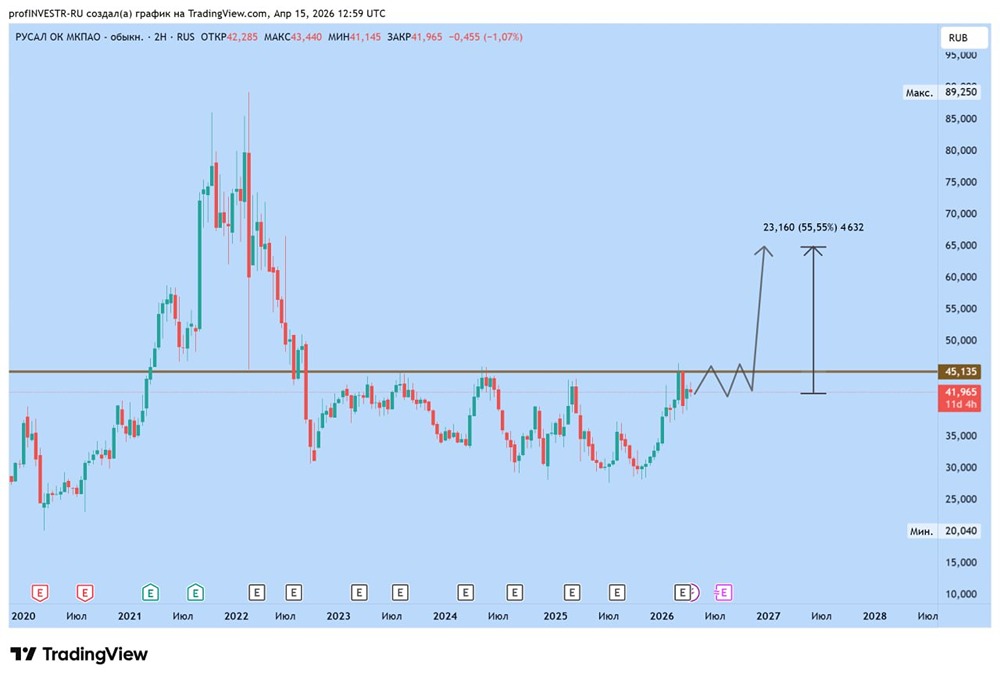 Четырехлетний боковик 30-45р. подходит к своему завершению! Ко второй половине года ожидаю выход и реализацию импульса до 50-60%. Опережающий индикатор, как движение цен на алюминий, уже показал рост от пробоя накопления 35%. К осени ожидаю более высокие темпы снижения КС и оживление широкого рынка ММВБ, что даст дополнительную поддержку. Мы заходили со средней 37 рублей и фиксировать пока не стали, держим до возможного выхода и отработки указанного потенциала. Данный материал носит информационный характер и [не является индивидуальной инвестиционной рекомендацией](https://mondiara.com/communities?open=community-1163) или предложением о покупке или продаже указанной ценной бумаги. Источник: PRO инвестиции