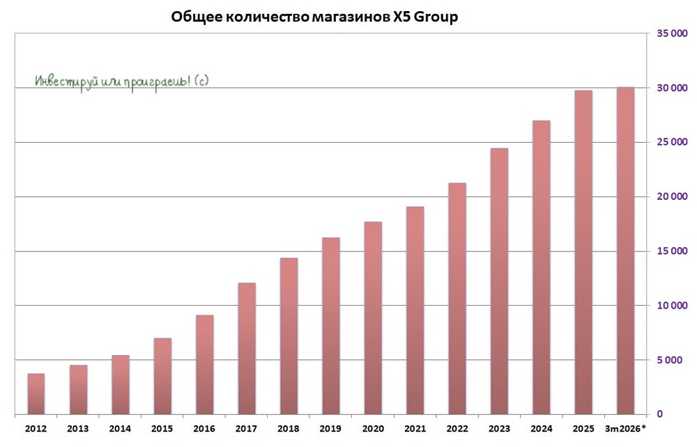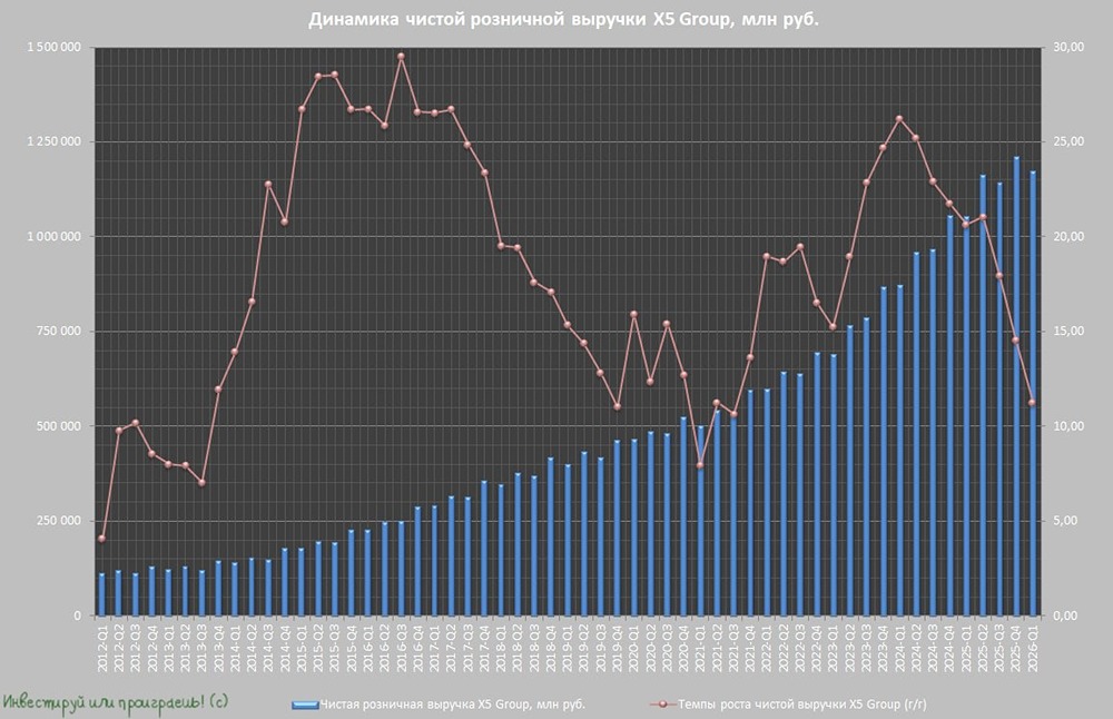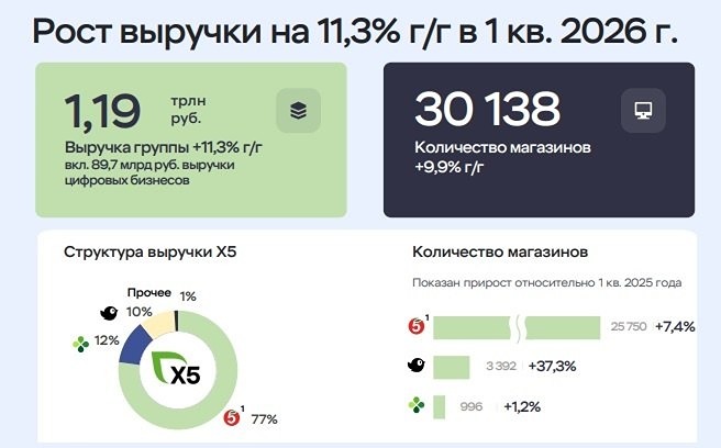 Дивергенция, которая может принести прибыль: разбираем отчёт X5. Лидер отечественного продуктового ритейла X5 представил в четверг свои операционные результаты за 1 кв. 2026 года, опираясь на которые давайте попробуем оценить инвестиционные перспективы эмитента и порассуждаем, достойны ли акции компании попадания в наши портфели на текущей коррекции. Итак, выручка X5 с января по март увеличилась на +11,3% (г/г) до 1,2 трлн руб., благодаря сочетанию расширения торговых площадей и росту среднего чека. Оценки Росстата и крупнейших российских банков дружно указывают на замедление потребительской активности: многие категории граждан заметно сократили свои траты в последнее время, и сектор розничной торговли также ощутил на себе эти последствия. Однако X5 продолжает расти двузначными темпами, что не может не радовать. Выручка цифровых бизнесов X5 продолжает демонстрировать опережающие темпы роста, прибавив на +26,6% (г/г) до 89,7 млрд руб. Компания продолжает укреплять лидерство на рынке e-grocery и удовлетворяет растущий спрос населения на доставку товаров. По оценкам агентства Data Insight, отечественный рынок e-grocery в 2026 году может вырасти на +26%. Причём основной драйвер роста — вовсе не расширение географии присутствия, а повышение частоты заказов постоянными клиентами, улучшение сервиса и расширение ассортимента. А поскольку Х5 исторически опережал динамику рынка, вполне вероятно, что компания и на этот раз сохранит высокие темпы роста. Важный показатель для ритейлеров — сопоставимые продажи (LFL). По итогам 1 кв. 2026 года мы видим рост на +6,1%, в первую очередь благодаря приросту среднего чека, который стабильно растет выше инфляции. Зато X5 продолжает активно расширяться! В отчётном периоде ритейлер открыл в общей сложности 348 новых магазинов разных форматов, доведя их количество до 30 138 шт. Компания сейчас делает ставку на два динамично развивающихся формата: «Пятёрочки» (магазины у дома). Их популярность объясняется экономией времени (пешая доступность) и низкими ценами — это цепляет покупателей в условиях экономии. «Чижики» (дискаунтеры). Рост спроса на них связан с переходом населения к сберегательной модели из‑за высоких ставок по депозитам. Кроме того, меняется восприятие дискаунтеров: теперь это не просто «дешёвые магазины», а места, где можно найти качественную продукцию по выгодной цене. Что любопытно, несмотря на двузначные темпы роста, акции #X5 торгуются сейчас вблизи своих 2-летних минимумов. Впрочем, такая дивергенция между фундаментальными показателями и котировками — не редкость для фондового рынка. Рано или поздно она обязательно нивелируется, и в этом контексте бумаги ритейлера выглядят интересными для долгосрочных покупок. Тем более на фоне текущей коррекции в район сильной зоны поддержки в районе 2500 пунктов. На текущий момент на долю акций X5 в моём портфеле приходится 2,3%, и по доле присутствия это у меня бумага №4! Верю в эту историю и жду рекомендацию СД по финальным дивидендам за 2025 год! Данный материал носит информационный характер и [не является индивидуальной инвестиционной рекомендацией](https://mondiara.com/communities?open=community-1163) или предложением о покупке или продаже указанной ценной бумаги. Источник: Инвестируй или проиграешь | Юрий Козлов
