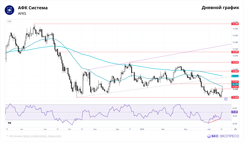 Мнение БКС Экспресс. В четверг акции АФК «Система» выросли на 1,47%, закрывшись на отметке 12,528 рубля. Объем торгов был высоким — 2,17 млрд рублей. Утром в пятницу акции снизились на 0,6%. Краткосрочная перспектива В четверг акции АФК «Система» заметно подорожали на фоне высокой торговой активности. Российские акции в целом торговались разнонаправленно: индекс МосБиржи снизился на 0,03% по итогам основной сессии и вырос на 0,18% с учетом вечерней сессии. В первой половине дня акции АФК «Система» активно росли, но затем последовал откат, и они потеряли большую часть дневного прироста. По итогам дня акции закрылись с небольшой белой свечой, что вызвало опасения из-за активизации продавцов по мере роста. Акции лишь немного отошли от минимумов и не полностью восстановили бычью дивергенцию по RSI, образовавшуюся на дневном графике. На этом фоне акции могут подняться до 12,94 рубля, где проходит более явное сопротивление. Также возможно тестирование пробитой в октябре наклонной линии на уровне 13,4 рубля, рядом с 200-дневной EMA. Сегодня рост будет затруднен из-за пятницы. Кроме того, индекс МосБиржи сохраняет нисходящую структуру, которая может вернуть бенчмарк к уровню 2700 пунктов, что не способствует росту отдельных акций. Внешний фон В четверг S&P 500 вырос на 0,26%. Фьючерс на индекс утром в плюсе на 0,1%. Индексы Азии снижаются. Фьючерс на Brent на Мосбирже вырос на 3,01%, а на мировых площадках нефть утром в минусе на 0,5%, торгуется по $94,5 за баррель. Уровни сопротивления: 12,56, 12,94, 13,87 Уровни поддержки: 11,93, 11,6, 10 Долгосрочная перспектива Глобальная динамика акций задается пологим восходящим трендом с осени 2008 года. Можно выделить еще один тренд — от декабря 2014 года, который поддерживал котировки в 2018 и 2022 годах. В 2024 году акции немного не достигли этого уровня, который сейчас находится около 11,8 рубля. С июля 2014 года существует долгосрочный нисходящий тренд, по которому бумаги потеряли 74% от исторического максимума. Нисходящий тренд от мая 2024 года был сломлен, но дальнейший рост оказался неустойчивым. Акции пока не могут преодолеть 200-дневную EMA. В последние недели амплитуда движения акций снизилась. Две последние свечи на старшем таймфрейме закрылись нейтрально, что может указывать на формирование локального дна около 11,93 рубля. Аналитики БКС оценивают акции АФК «Система» как «нейтральные», прогнозируя целевую цену на горизонте 12 месяцев в 17 рублей. Автор: Решетников Олег Данный материал носит информационный характер и [не является индивидуальной инвестиционной рекомендацией](https://mondiara.com/communities?open=community-1163) или предложением о покупке или продаже указанной ценной бумаги. Источник: bcs-express.ru