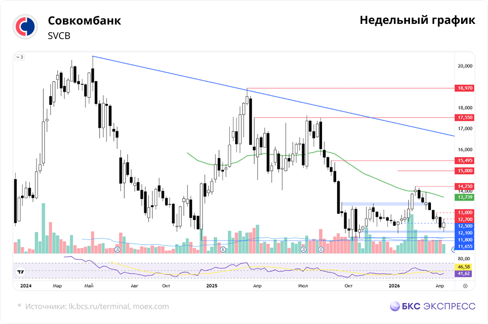 Мнение БКС Экспресс. Акции Совкомбанка в четверг упали на 1,03%, достигнув 12,47 рубля. Объем торгов составил 814 млн рублей, что считается средним показателем. Сегодня утром бумаги немного выросли на 0,2% по сравнению с закрытием четверга. Краткосрочная перспектива • Акции Индекса МосБиржи в течение дня не имели четкого направления движения. Сам индекс вырос на 0,03% по итогам основной сессии, но на вечерних торгах потерял 0,19% относительно среды. • Акции Совкомбанка на этой неделе достигли уровня поддержки в 12,1 рубля, что остановило рост, начавшийся с января 2023 года. От февральских максимумов бумаги отступили на 15%, но позитивные корпоративные новости помогли частично компенсировать потери. Наблюдается попытка замедлить нисходящее движение около технической поддержки. • Несмотря на технический негатив, акции отскочили от уровня 12,1 рубля благодаря нескольким внутренним и внешним факторам. Из корпоративных новостей: Совкомбанк завершил сделку по приобретению 100% ООО «Капитал Лайф Страхование Жизни» без дополнительной эмиссии акций. Также активно обсуждается предстоящее IPO B2B-РТС. • Позитивным сигналом стало улучшение монетарных перспектив на апрельском заседании ЦБ. Недельная инфляция неожиданно снизилась до нуля, а инфляционные ожидания населения опустились до уровня октября 2023 года. Президент России поручил представить предложения по ускорению экономического роста. Мы ожидаем снижения ключевой ставки до 14,5%, что совпадает с рыночными прогнозами. • Вчера акции Совкомбанка снижались из-за слабых перспектив дивидендов. Первый зампредправления Сергей Хотимский объявил, что компания не планирует повышать уровень выплат в 2024 году относительно 2023 года (10% от чистой прибыли МСФО). • Многие акции российского рынка растут в преддверии заседаний Банка России, но после публикации решения регулятора происходит переоценка перспектив, что часто приводит к коррекции. Поэтому не исключено продолжение роста акций Совкомбанка до 13 рублей с последующей коррекцией. Внешний фон В четверг индекс S&P 500 вырос на 0,26%. Сегодня фьючерсы на S&P 500 в плюсе на 0,1%. Азиатские индексы преимущественно снижаются. На мировых рынках фьючерсы на нефть марки Brent падают на 1,3%, достигнув $98,1 за баррель. Уровни сопротивления: 12,7; 13; 13,3 Уровни поддержки: 12,1; 11,8; 11,66 Долгосрочная перспектива • Первичное размещение акций прошло в декабре 2022 года по цене 11,5 рубля за акцию. В течение полугода акции выросли на 75%, достигнув 20,5 рубля. От исторического максимума бумаги начали падать, вернувшись к цене IPO. • Во второй среднесрочной волне роста акции приблизились к 19 рублям, после чего вернулись к уровню IPO. Оба цикла роста и падения заняли около года. • В феврале 2023 года акции закрылись в плюсе, но в марте все достижения были потеряны. Ожидается стабилизация бумаг после разнонаправленных колебаний в первом квартале 2023 года. • В 2023 году акции безуспешно пытаются закрепиться выше 200-дневной скользящей средней. В середине февраля граница была пробита, но в марте котировки вернулись ниже. • Финансовые результаты компании за 2022 год оказались умеренно позитивными, отражая снижение стоимости риска и рост чистого процентного дохода. Развитие цикла смягчения денежно-кредитной политики и точечные операции по слиянию и поглощению создают значительный потенциал для роста акций. • Анал