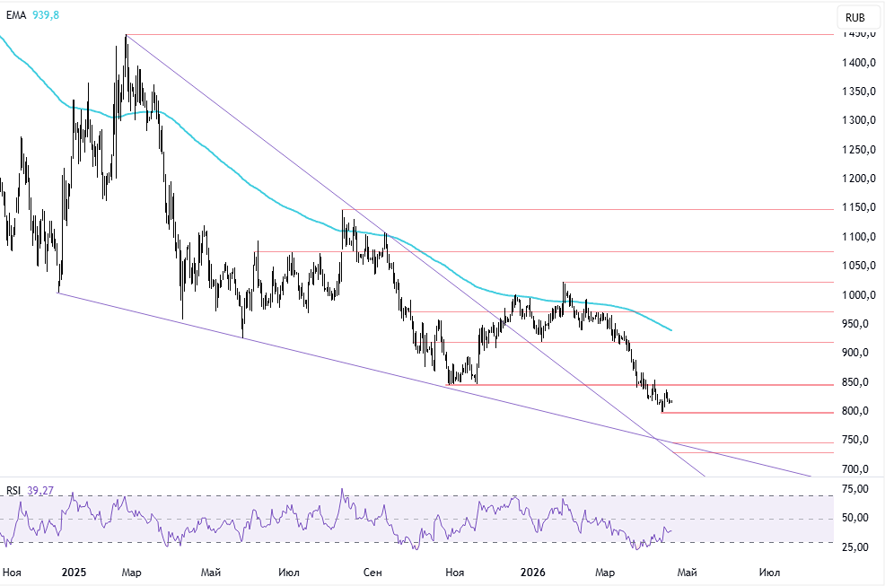 Мнение БКС Экспресс. Акции Северстали в пятницу, 17 апреля, снизились на 0,73% до 817,8 руб., а объем торгов составил 0,62 млрд руб. На утренней сессии понедельника котировки немного выросли, прибавив 0,1%, и держатся около 818 руб. Краткосрочная перспектива • В четверг акции Северстали попытались отскочить, но не смогли закрепиться выше 200-часовой скользящей средней и завершили день с откатом. Это снижение продолжилось и в пятницу. • Утром понедельника бумаги показывают незначительный рост, но фундаментальных причин для оживления спроса пока нет. На этой неделе компания представит финансовые результаты за первый квартал 2026 года, которые, по нашим прогнозам, окажутся хуже, чем годом ранее. • Слабая попытка подняться выше 200-часовой скользящей средней указывает на слабость акций. В центре внимания остается уровень поддержки около 800 руб. Прорыв этой линии может открыть новый ориентир для снижения — район 748 руб., где проходит диагональная поддержка от минимумов 2024 года. Ниже находится граница нисходящего тренда от максимумов 2025 года на уровне 730 руб. • При отскоке целью остается выход выше 200-часовой скользящей средней на уровне 826 руб., а затем продвижение к минимумам 2025 года — 845 руб. Закрепление выше этого уровня откроет новые перспективы восстановления: 875 руб., а затем — 900 руб. Внешний фон • Индекс S&P 500 завершил пятницу ростом на 1,2%, но утром понедельника фьючерсы теряют 0,6%. Азиатские индексы показывают положительную динамику: японский Nikkei поднялся на 0,7%, гонконгский Hang Seng и китайский Shanghai Composite — на 0,8 и 0,7% соответственно. Нефть Brent утром выросла на 5,7% до $95,5 за баррель. Уровни сопротивления: 826, 845, 875 Уровни поддержки: 800, 748, 730 Четырехчасовой график Долгосрочная перспектива • Решение ЦБ в декабре 2024 года сохранить ставку без изменений и улучшение ситуации на Украине помогли акциям Северстали отскочить от минимумов 2024 года на уровне 1005,4 руб. В конце февраля 2025 года акции достигли 1450 руб., но весь рост был нивелирован, и котировки вновь обновили минимумы. • В 2025 году техническая картина улучшилась после выхода из нисходящего тренда, однако попытки достичь следующей цели и закрепиться выше 200-дневной скользящей средней не увенчались успехом, и акции снова упали до новых минимумов года. • В январе 2026 года акции вновь пробили важную преграду, но не смогли удержаться выше. Начался откат, который привел к новым минимумам с декабря 2022 года. В фокусе продавцов теперь возвращение в нисходящий тренд от максимумов 2025 года. • Мы пересмотрели Стратегию на второй квартал 2026 года. Для черной металлургии пока не видим перспектив разворота из-за высокой ключевой ставки, которая, по нашим прогнозам, сохранится в течение всего 2026 года. Взгляд на Северсталь изменился с «Негативного» на «Нейтральный» из-за серьезной просадки, но целевая цена остается на уровне 1000 руб. Автор: Попова Анастасия Данный материал носит информационный характер и [не является индивидуальной инвестиционной рекомендацией](https://mondiara.com/communities?open=community-1163) или предложением о покупке или продаже указанной ценной бумаги. Источник: bcs-express.ru