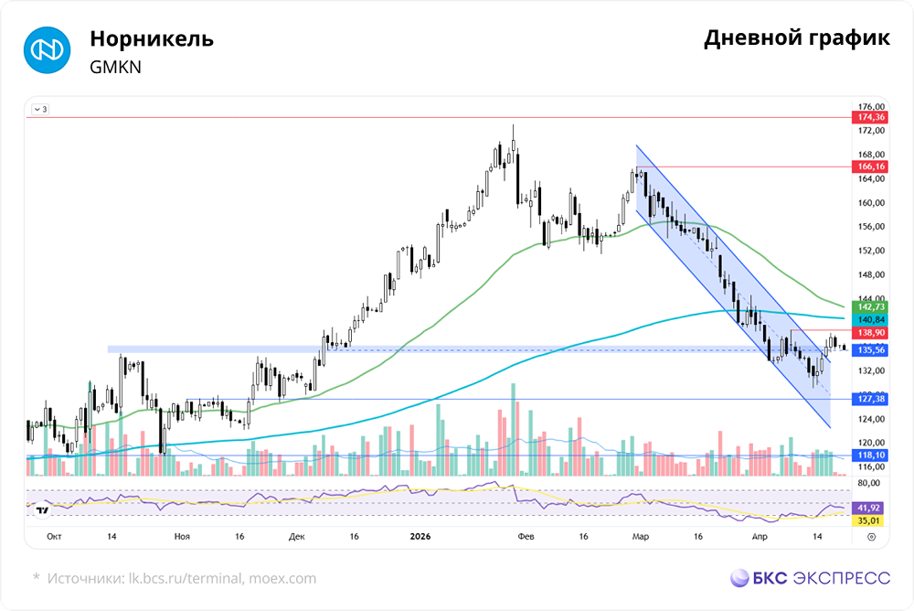 Мнение БКС Экспресс. Акции «Норникеля» в пятницу выросли на 1,12%, до 137,68 руб. В выходные они потеряли 0,99%, опустившись до 136,32 руб. Объем торгов в пятницу составил 2,5 млрд руб. Утром понедельника акции открылись ниже закрытия воскресенья на 0,4%. Краткосрочная картина • Акции Индекса МосБиржи в пятницу торговались преимущественно в минусе. Сам индекс упал на 0,63% за основную сессию и еще на 0,55% на вечерних торгах. • Снижение российского рынка в пятницу было вызвано заявлением главы МИД Ирана об открытии Ормузского пролива. Это вызвало коррекцию акций нефтегазовых компаний, которые составляют около половины Индекса МосБиржи. В выходные негативные настроения усилились из-за новостей об ультиматумах и атаках на суда США и Ирана. • Акции «Норникеля» росли на фоне возможной деэскалации. Они прибавляли в цене вместе с платиноидами и медью. В течение дня бумаги торговались в плюсе, особенно в период основных торгов. К концу дня покупатели пытались удержать достигнутый уровень. • С вторника по пятницу акции «Норникеля» росли, прервав шестинедельное снижение. Несмотря на откат на выходных, они завершили неделю выше мартовского нисходящего тренда. Это сгладило часть негативных сигналов и создало условия для формирования локального минимума. • На этой неделе ожидается пауза в движении рынка. Монетарная политика может измениться только под влиянием внешних факторов или статистики. В пятницу ослабление рубля остановилось, но крепкий рубль дает пространство для снижения ключевой ставки. • У покупателей есть шанс пробить уровень 139 руб. и приблизиться к 200-дневной скользящей средней. Падение в выходные не показательно из-за низкой активности. Этот сценарий может реализоваться до середины недели, если не появятся новые негативные факторы и данные по инфляции в среду будут позитивными. К концу недели возможна коррекция после фиксации части позиций. Внешний фон В пятницу S&P 500 вырос на 1,2%, но сегодня фьючерсы на него в минусе на 0,5%. Индексы Азиатско-Тихоокеанского региона (АТР) в основном снижаются. На мировых рынках платина падает на 0,9%, палладий — на 0,6%, медь — на 0,3%, а никель растет на 2%. Уровни сопротивления: 138,9 / 141,3 / 151,5 Уровни поддержки: 127,4 / 118,1 / 113 Долгосрочная картина • «Норникель» опубликовал хорошую отчетность за 2025 год по МСФО. Выручка выросла на 10% до $13,7 млрд, EBITDA — на 9% до $5,7 млрд. Скорректированная чистая прибыль сократилась на 7% до $1,9 млрд из-за роста налогов и процентов по долгу. Свободный денежный поток увеличился на 360% до $1,6 млрд. Чистый долг снизился до $9,1 млрд, а его соотношение к EBITDA уменьшилось с 1,9x до 1,6x. • Компания прогнозирует профицит по никелю в 2026 году, но дефицит по меди и платине. Рынок палладия останется сбалансированным, но избыточный спрос может вызвать дефицит. • Закрытие мартовской свечи дало медвежий сигнал, так как инициатива перешла к продавцам. Результат за месяц стал худшим с августа 2024 года. • Долгосрочная техническая картина нейтральная. Драгметаллы откатились от рекордов, но остаются дорогими. Ожидается постепенное снижение ключевой ставки ЦБ до 13% к концу 2026 года. Возобновление дивидендов возможно не раньше 2026 года при достаточных выплатах от ГРК «Быстринское». • Целевая цена аналитиков БКС на год составляет 180 руб. Оценка бумаг — «Позитивная». Автор: Смирнов Андрей Данный материал носит информационный