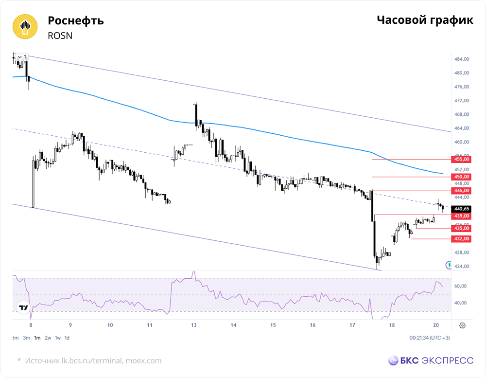 Мнение БКС Экспресс. Вчера акции Роснефти подорожали на 2,38% по сравнению с закрытием пятницы, достигнув 438,15 руб. Объем торгов составил 4,2 млрд руб. На утренней сессии рост ускорился до 3,03%, или 440,9 руб. Краткосрочная ситуация В выходные акции компании заметно подорожали при невысоком объеме торгов. Бумаги почти полностью отыграли пятничное падение. Они продолжают реагировать на сильные колебания цен на нефть, поэтому их динамика больше зависит от важных внешних новостей, чем от технических факторов. Месячный откат от мартовских максимумов может завершиться около текущих уровней. Хотя закрытие прошло ниже 200-часовой скользящей средней, краткосрочная техническая картина остается умеренно позитивной. Утреннее значение индикатора относительной силы (RSI) на часовом графике приближается к зоне перекупленности. После недавних колебаний акции Роснефти могут стабилизироваться около текущих уровней. Некоторое время они могут удерживаться в диапазоне 435–450 руб. Однако краткосрочная техническая картина может быстро измениться при очередном скачке цен на нефть. Внешний фон Индекс S&P 500 в пятницу вырос на 1,2%. Утром фьючерсы на S&P 500 снижаются на 0,7%. Азиатские фондовые рынки преимущественно растут. Нефть Brent подорожала на 5,5%, до $95,4 за баррель. Уровни сопротивления: 446 / 450 / 455 Уровни поддержки: 439 / 435 / 432 Долгосрочная ситуация В конце октября акции Роснефти достигли минимума с мая 2023 г. После этого среднесрочный нисходящий тренд прекратился. Позже произошел резкий рост вслед за скачком нефтяных цен на фоне ближневосточного конфликта. Сейчас акции частично потеряли свой среднесрочный прирост, но все еще торгуются выше 200-дневной скользящей средней. Долгосрочная техническая картина остается нейтральной. Аналитики БКС прогнозируют целевую цену акций Роснефти на горизонте года в 610 руб., что составляет +38%. Их взгляд на бумагу — «позитивный». Автор: Манжос Виталий Данный материал носит информационный характер и [не является индивидуальной инвестиционной рекомендацией](https://mondiara.com/communities?open=community-1163) или предложением о покупке или продаже указанной ценной бумаги. Источник: bcs-express.ru